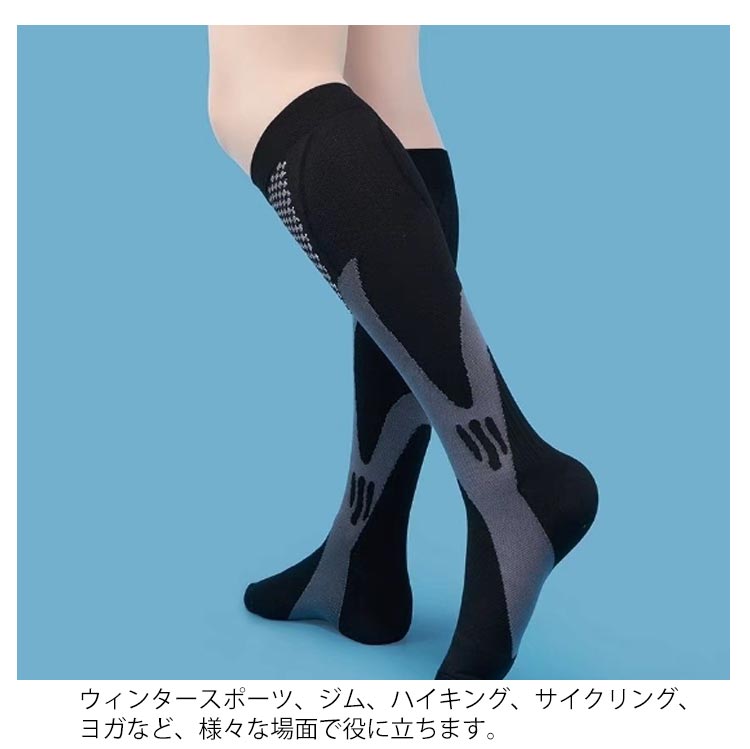 機能性抜群の圧着男女兼用スポーツソックス通気性に優れる素材を使い、長時間履いていても足元はいつも爽やかに保てます。段階的な着圧力があるので足の疲労を軽減できます。2足組なので、旅行での利用や、普段の洗い替えにも便利。ウィンタースポーツ、ジム、ハイキング、サイクリング、ヨガなど、様々な場面で役に立ちます。女性から男性まで使えるサイズ&カラー展開、スポーツだけでなく寒い季節の普段用にもおすすめ。