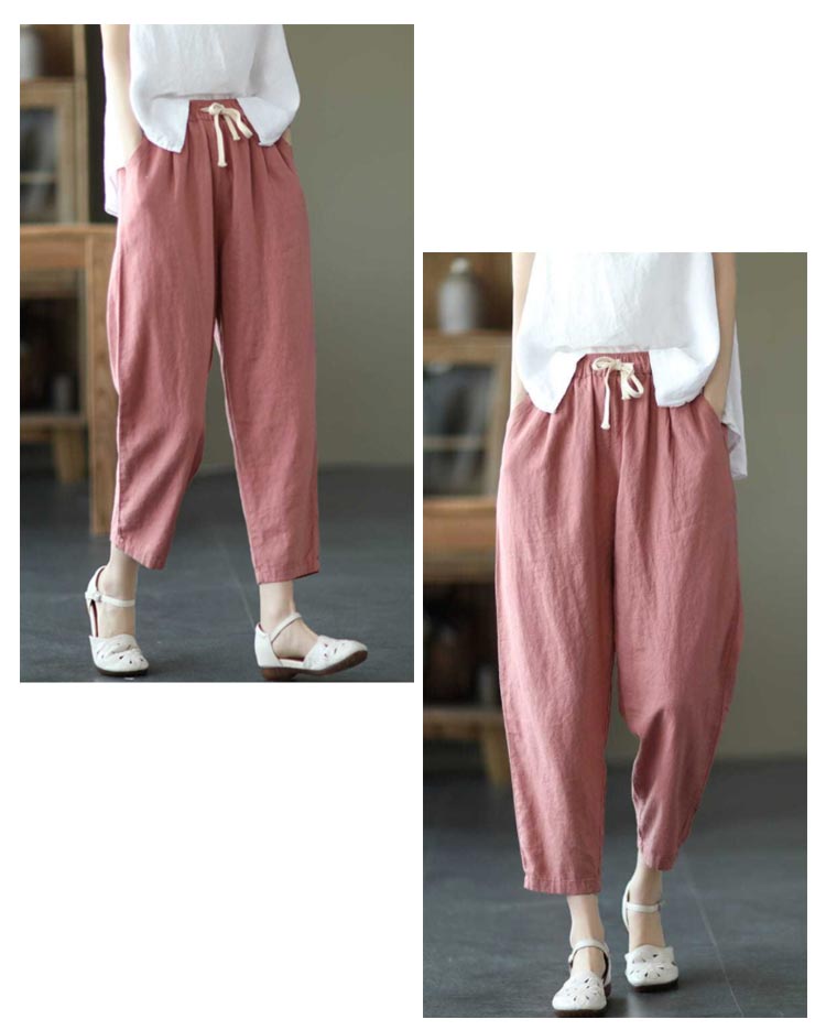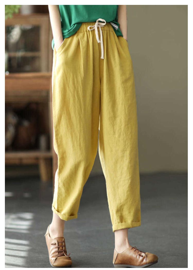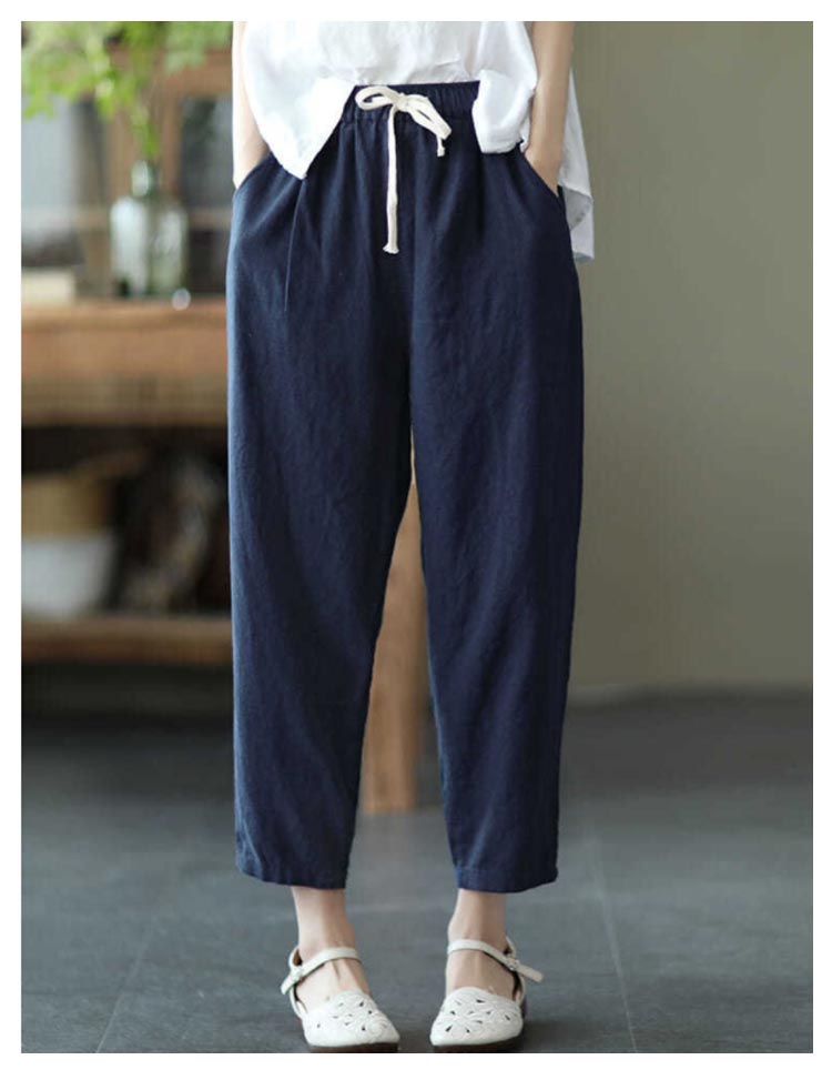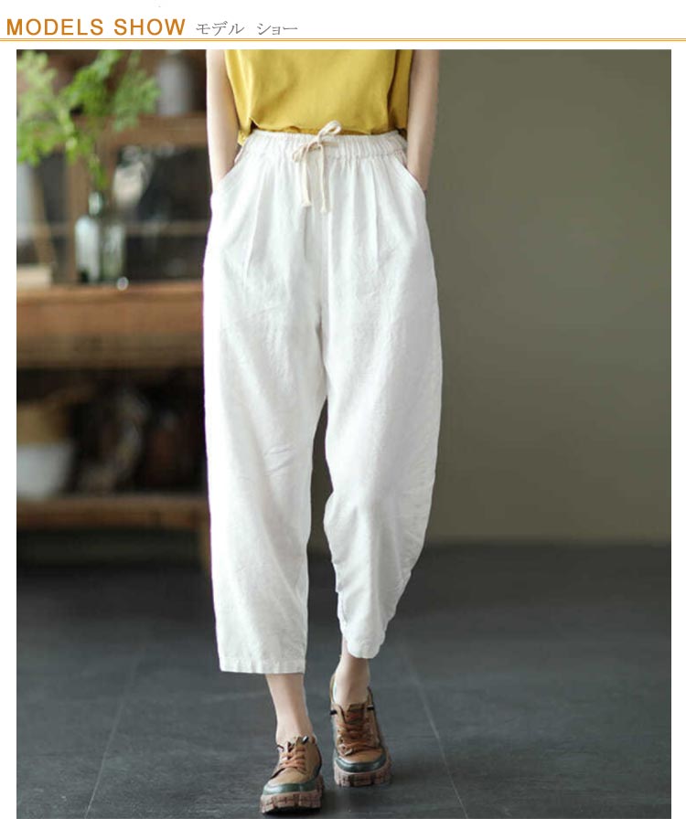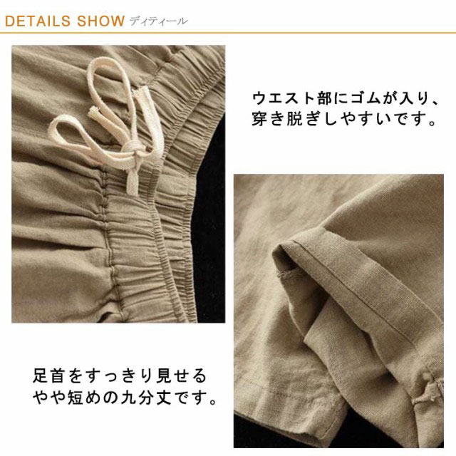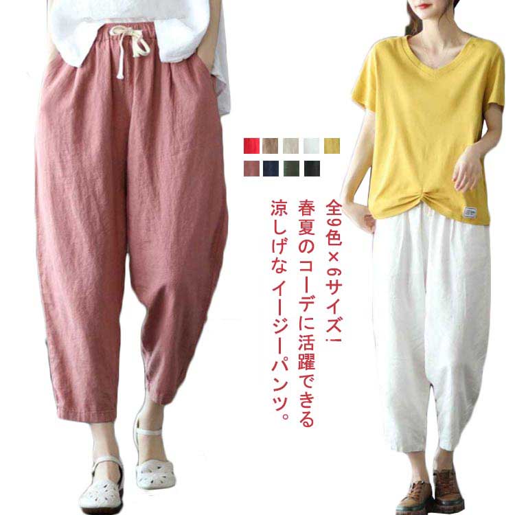 全9色×6サイズ!春夏のコーデに活躍できる涼しげな綿イージーパンツ。豊富なカラバリ展開で色違い揃いにもオススメです。清涼感あり、薄い素材タイプ、夏の間も着用ができるほど薄手で肌触り。足首をすっきり見せるやや短めの九分丈です。 ウエスト部にゴムが入り、穿き脱ぎしやすいです。 森ガールのナチュラルな風合いと生地もストレスフリー。シンプル無地デザインだからどんなトップスとも好相性◎