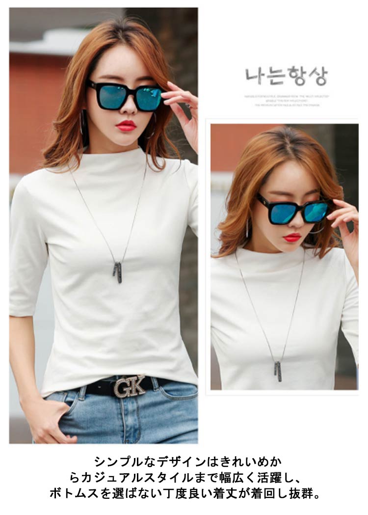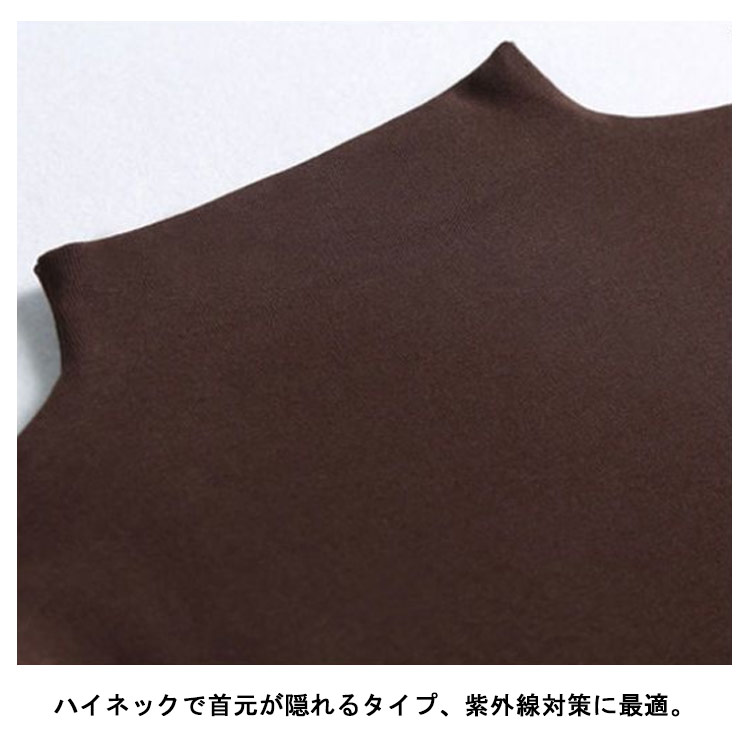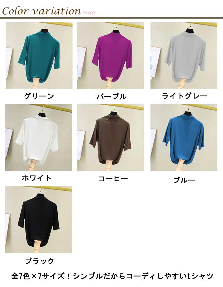 全7色×7サイズ!シンプルだからコーディしやすいtシャツ生地は薄手で柔らかく、とろみ感があり気持ちいい肌触り。伸縮性抜群なので、体をぴったりフィットして快適な着心地を実現。ハイネックで首元が隠れるタイプ、紫外線対策に最適。シンプルなデザインはきれいめからカジュアルスタイルまで幅広く活躍し、ボトムスを選ばない丁度良い着丈が着回し抜群。