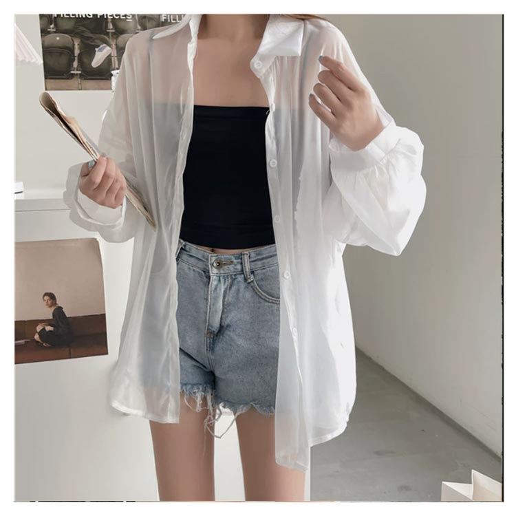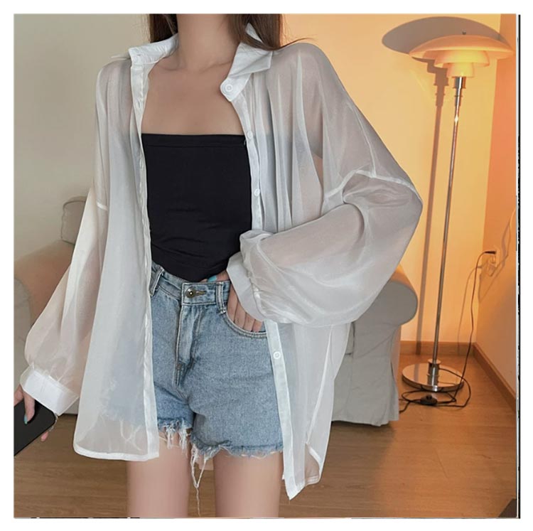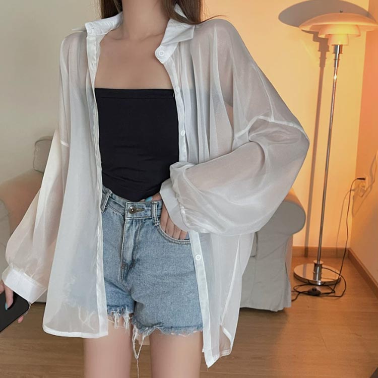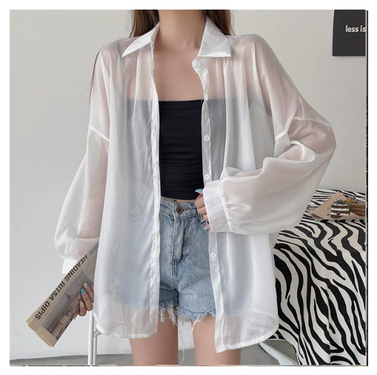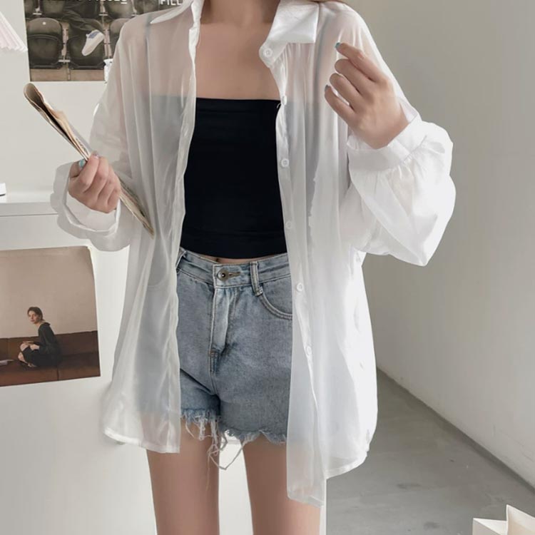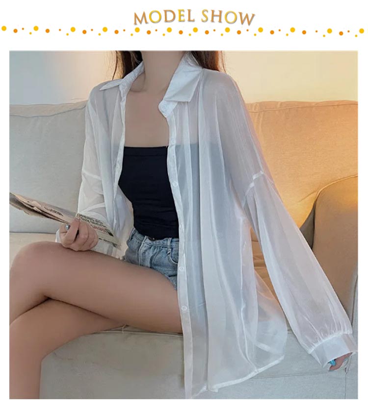 透け感 シアーシャツ レディース 日焼け止め UVカット ブラウス 長袖 トップス シャツ 前開き 重ね着 オーバーサイズ トレンド シースルー シンプル カジュアル おしゃれ ゆったり 日焼け対策 冷房対策 羽織 夏物 春 秋 ホワイト