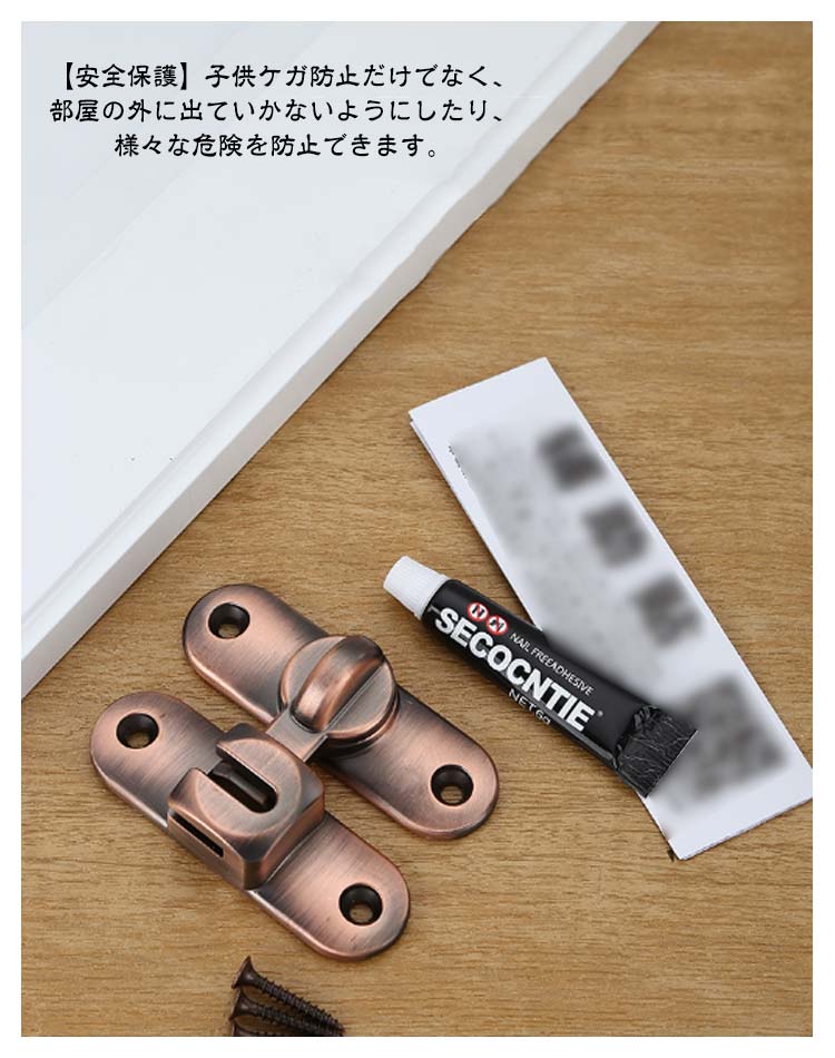 ネジと接着剤【高品質素材】高品質な亜鉛合金のドアバックルは、多層研磨仕上げで構成され、厚くて強化されたベース、強度が高く、腐食、錆や変色の心配はありません。簡単に壊れたり変形したりせず、耐久性に優れています。4球軸受構造を採用し、スムーズに回転でき、ワンタッチに簡単に開閉できます。【便利でシンプル】便利なフリップデザイン、プライバシーロック、フラップは、より快適な生活環境のためにさらなるセキュリティを提供します。【取付けも簡単】取り付け用のネジが付属しているため、留め具をすぐに設置する事ができます。左または右にインストールすることを選択できます。特殊タイプで90度の角度で取り付けられるため、ドアや窓の安全を確保するために使用できます。【安全保護】子供ケガ防止だけでなく、部屋の外に出ていかないようにしたり、様々な危険を防止できます。簡単施錠でスライドドアの防犯対策ができます。猫の脱走防止用としてもお使いいただけます。