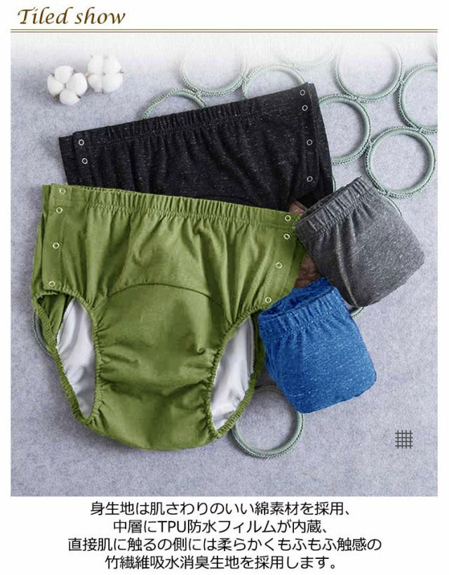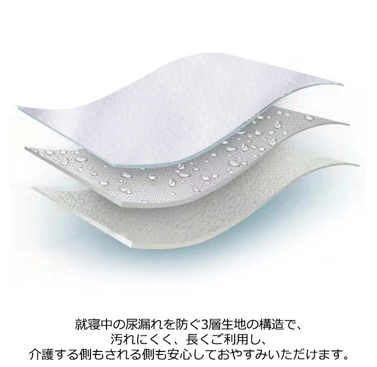 | 「3層構造」で尿漏れをしっかりガード。大人用防水おむつカバー。 身生地は肌さわりのいい綿素材を採用、中層にTPU防水フィルムが内蔵、直接肌に触るの側には柔らかくもふもふ触感の竹繊維吸水消臭生地を採用します。 就寝中の尿漏れを防ぐ3層生地の構造で、汚れにくく、長くご利用し、介護する側もされる側も安心しておやすみいただけます。 腰回りは柔らかで伸びのよい総ゴム仕様で、優しい履き心地です。着脱も簡単でおむつ交換、着替えも楽に行えます。 通気性が良い上質な綿素材を使用しています。肌ざわりが良く快適な着用感です。 介護時はもちろん、入院時で介助が必要な時、リハビリパンツとしても様々にお使いいただけます。 | |