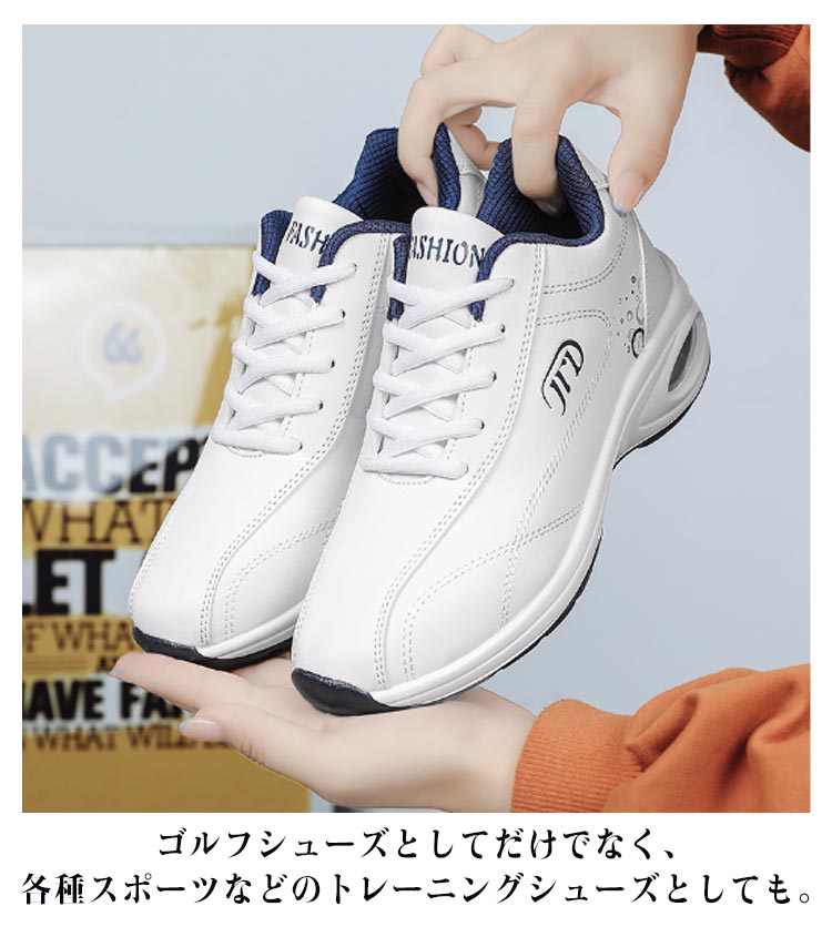 22.5-25cm!アッパー形状はシンプルなスニーカー型。 幅広・甲高ででとても履きやすい。EVA製でクッション性の高いソールは屈曲性があり、足の動きに負荷を与えにくいのが特徴です。軽くて疲れない履き心地!普段着用しているスニーカー感覚で履いていただいけます。撥水性に優れた防水でお手入れも簡単。ゴルフシューズとしてだけでなく、各種スポーツなどのトレーニングシューズとしても。普段履きはもちろん、ランニングやウォーキングシューズとしてもオススメです。外反母趾の方にもおすすめ!あらゆるシーンで大活躍する万能シューズ。