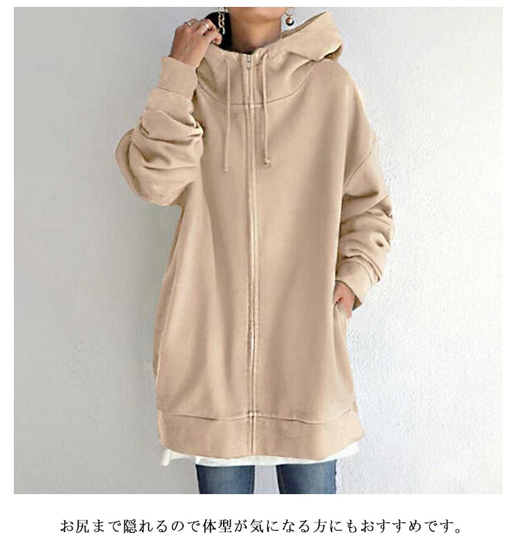 ロング丈のスウェットパーカー!ゆったりとしたサイズ感で楽に着用いただけます。お出かけにはもちろん、部屋着としても大活躍間違いなし!お尻まで隠れるので体型が気になる方にもおすすめです。