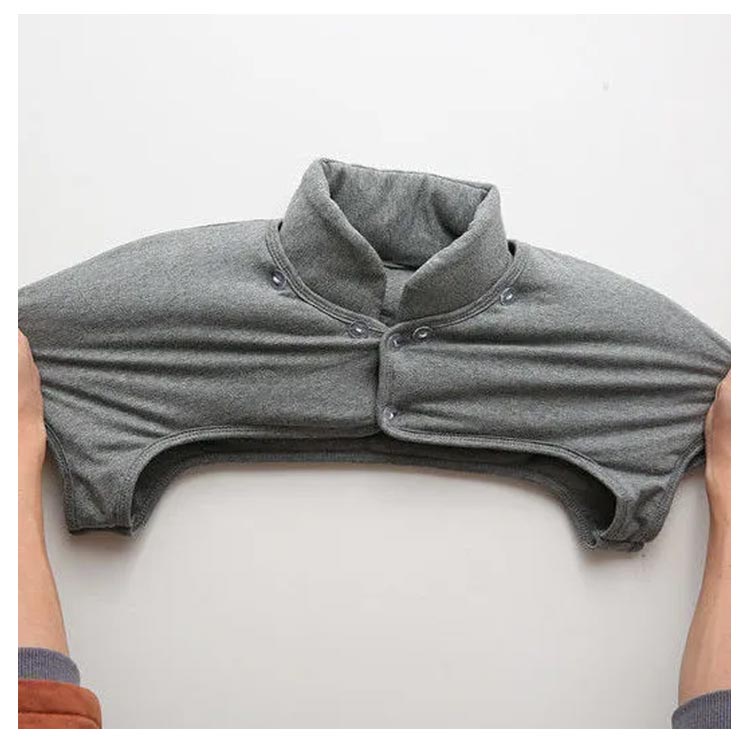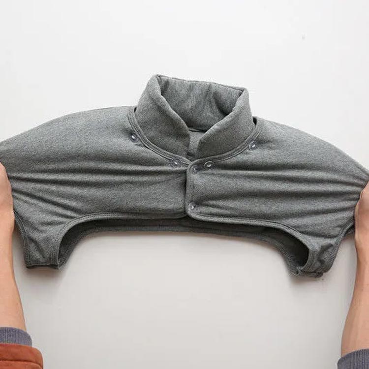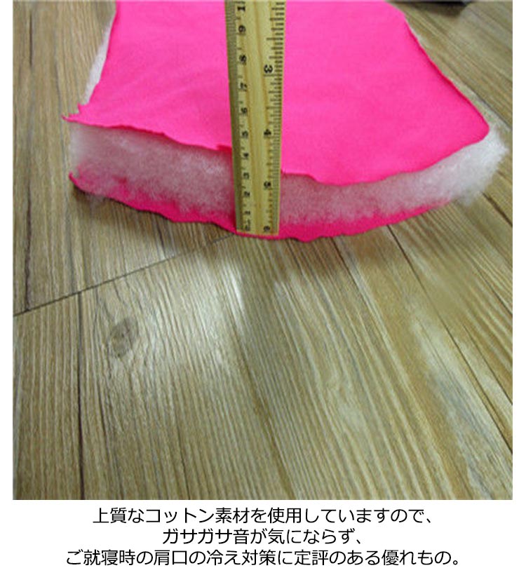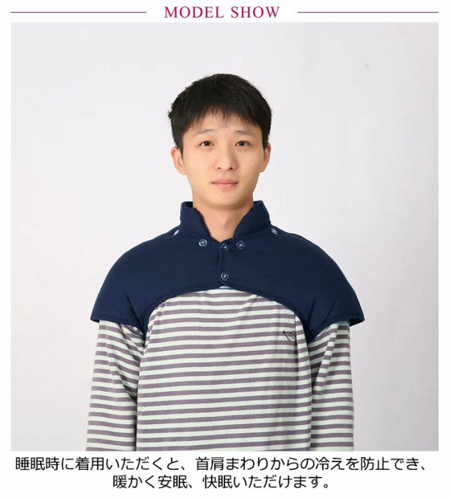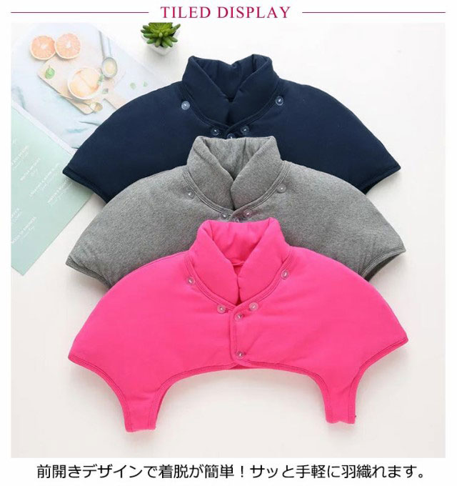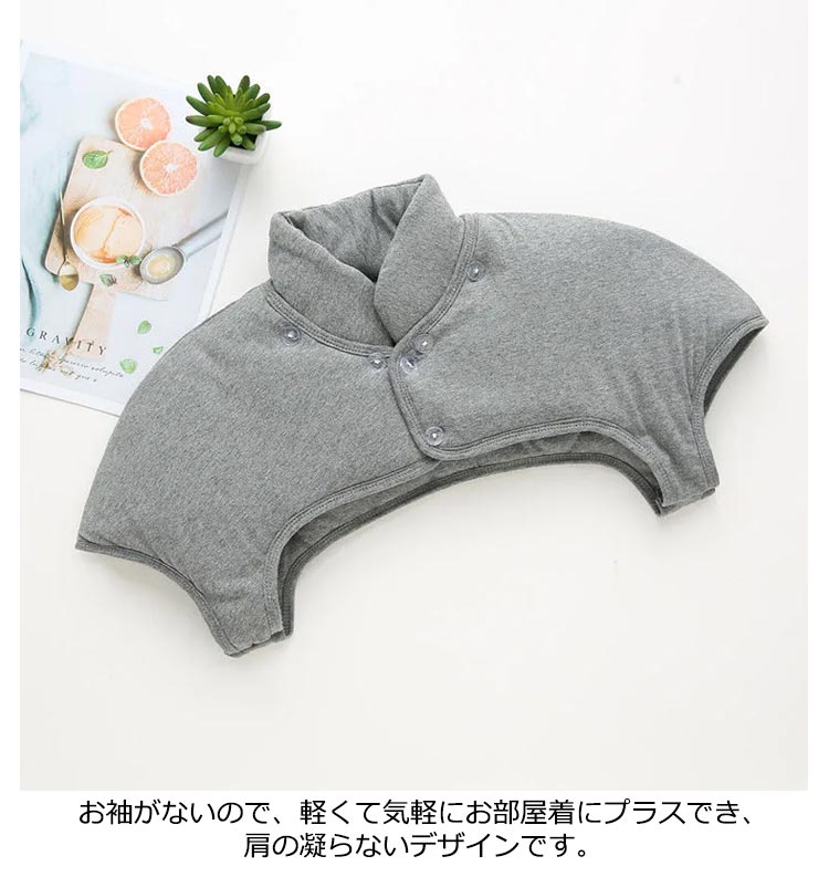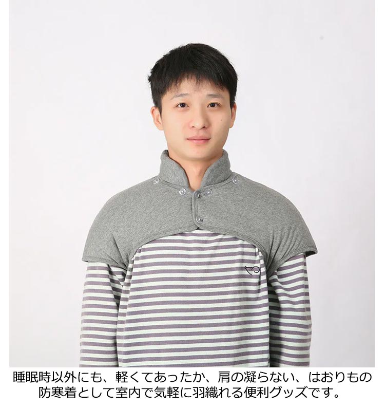 襟取り外し可能なエコダウン入りの肩当て。【男女兼用】【M-3XL】睡眠時に着用いただくと、首肩まわりからの冷えを防止でき、暖かく安眠、快眠いただけます。睡眠時以外にも、軽くてあったか、肩の凝らない、はおりもの 防寒着として室内で気軽に羽織れる便利グッズです。前開きデザインで着脱が簡単!サッと手軽に羽織れます。お袖がないので、軽くて気軽にお部屋着にプラスでき、肩の凝らないデザインです。上質なコットン素材を使用していますので、ガサガサ音が気にならず、ご就寝時の肩口の冷え対策に定評のある優れもの。秋から春まで長い期間お使い頂けます。