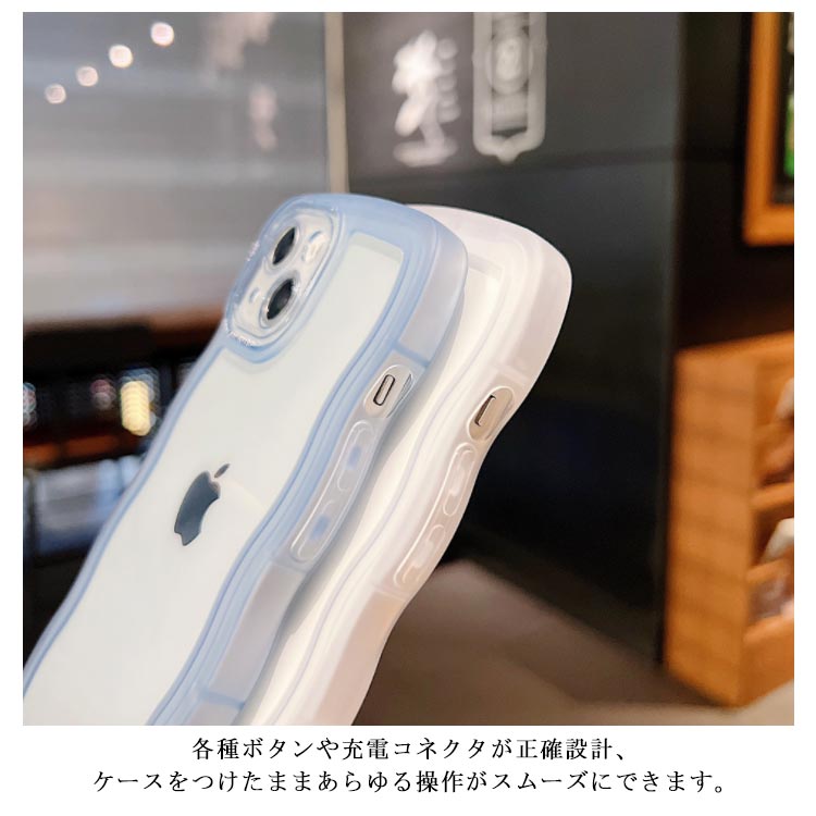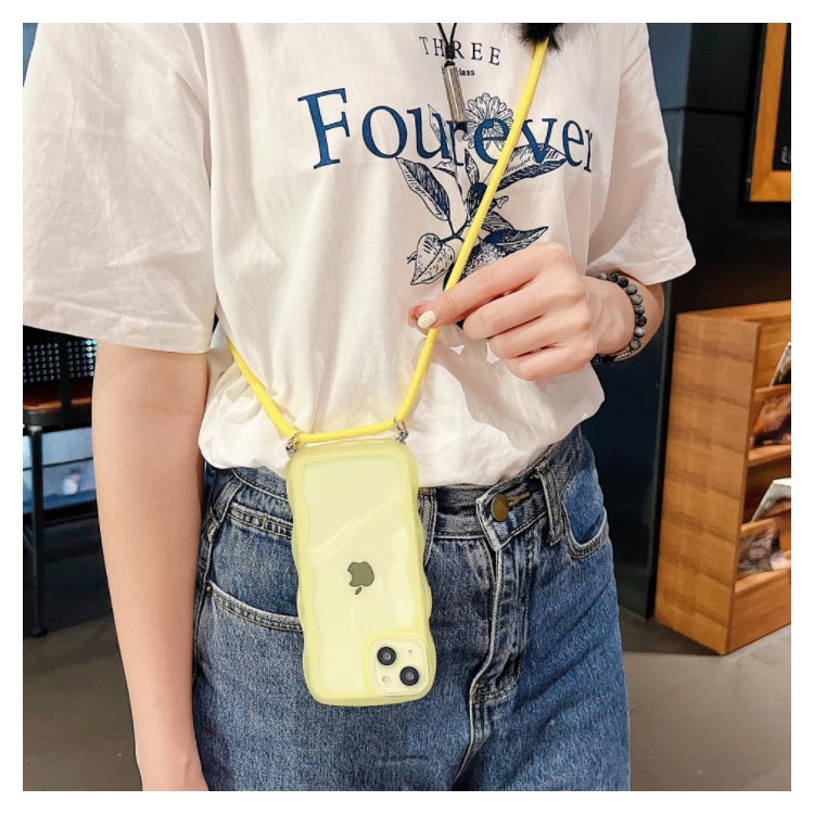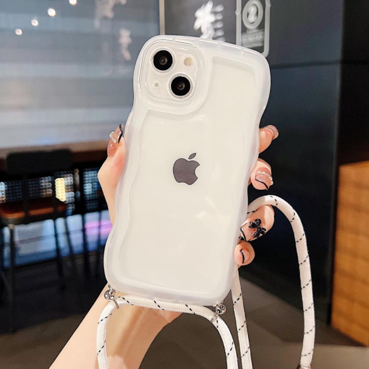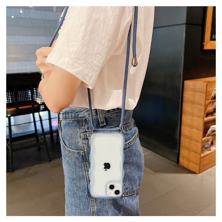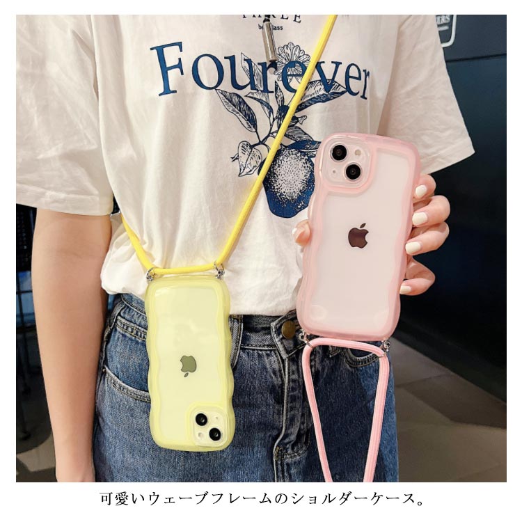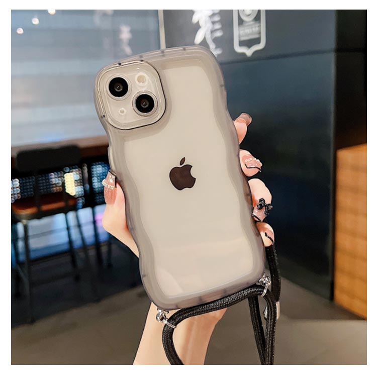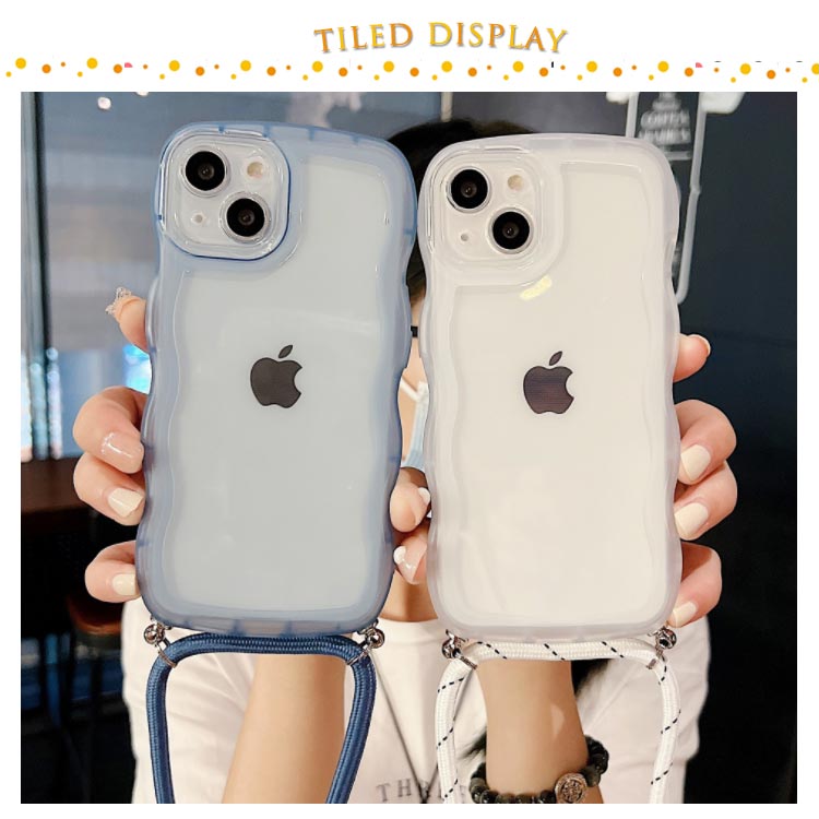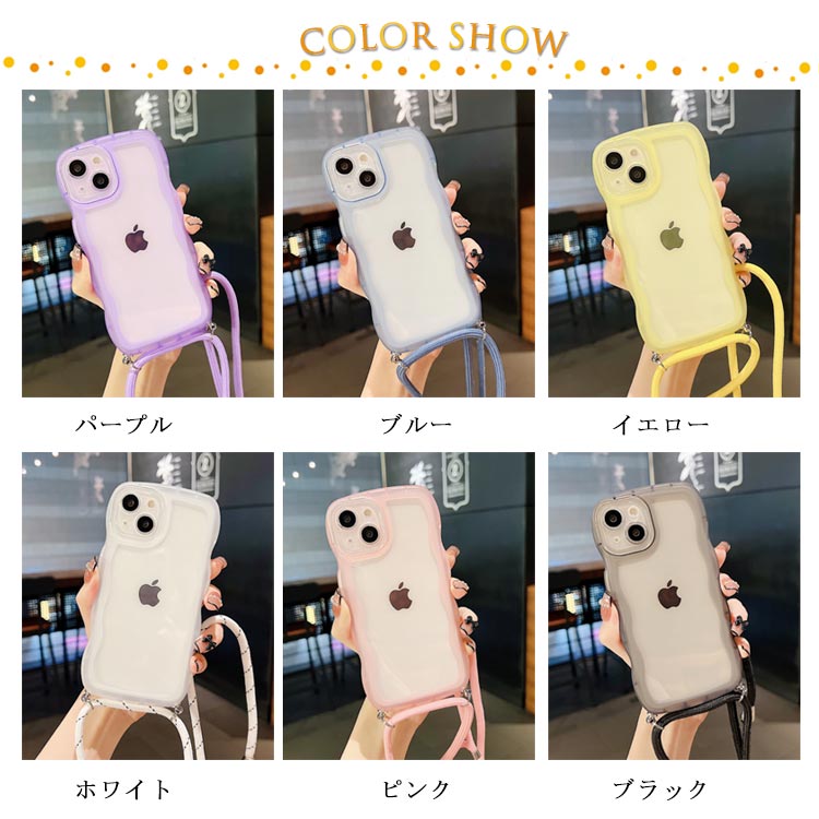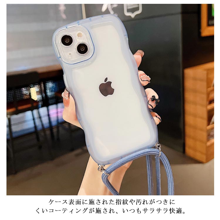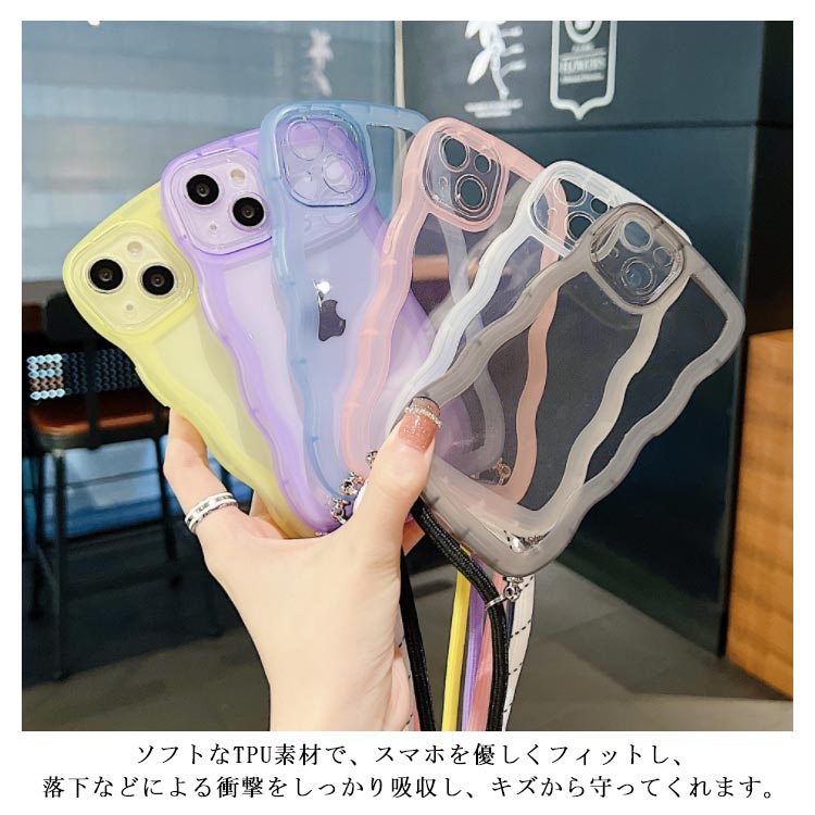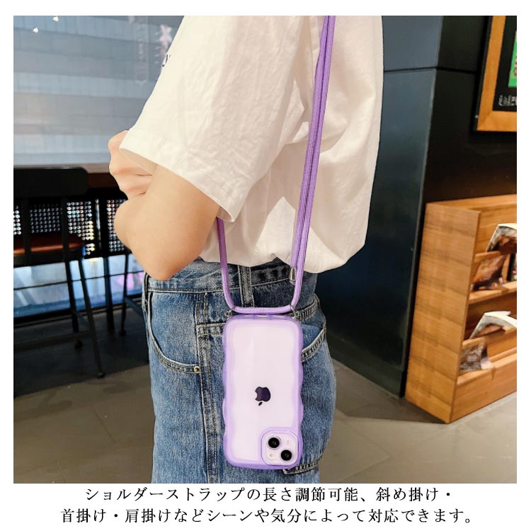可愛いウェーブフレームのショルダーケース。ソフトなTPU素材で、スマホを優しくフィットし、落下などによる衝撃をしっかり吸収し、キズから守ってくれます。透明デザインで、iphone本体の色を活かすのも◎お好きなステッカーや写真を入れて、カスタマイズも◎ケース表面に施された指紋や汚れがつきにくいコーティングが施され、いつもサラサラ快適。各種ボタンや充電コネクタが正確設計、ケースをつけたままあらゆる操作がスムーズにできます。ショルダーストラップの長さ調節可能、斜め掛け・首掛け・肩掛けなどシーンや気分によって対応できます。