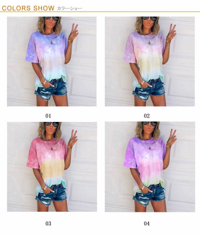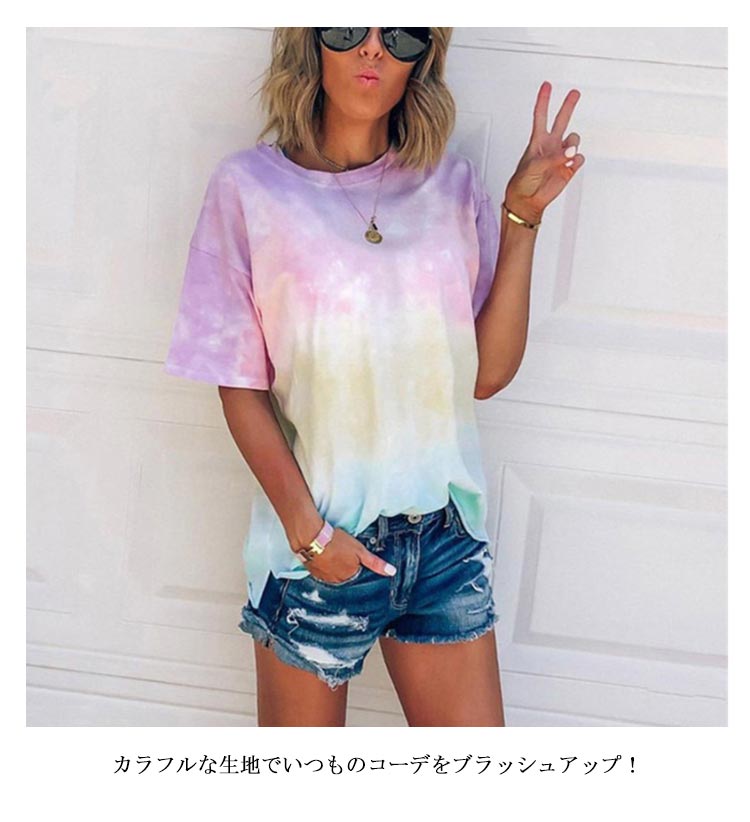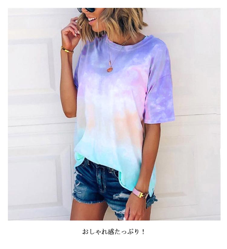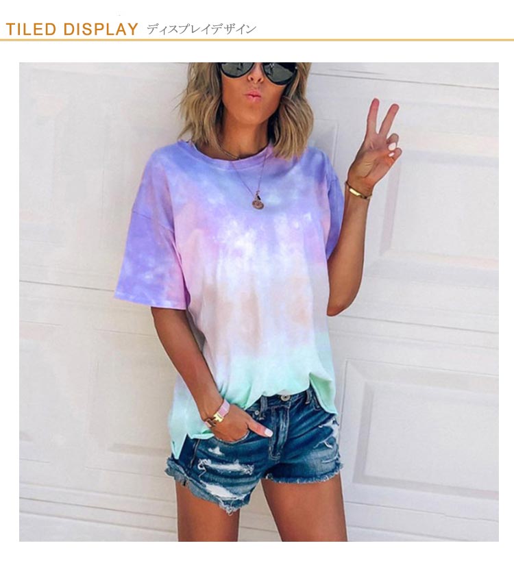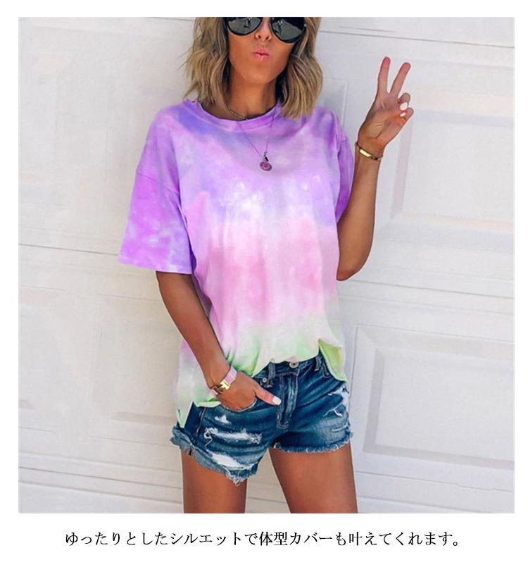| 【全7色! タイダイ染めTシャツ】 おしゃれ感たっぷり! カラフルな生地でいつものコーデをブラッシュアップ! カットソー素材を使用しているので、ストレスなく着用できます。 ゆったりとしたシルエットで体型カバーも叶えてくれます。 普段着はもちろん、ダンスウェアなどにもおすすめ一着。 | |