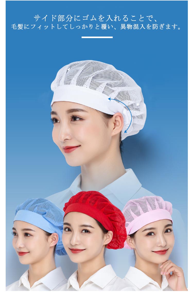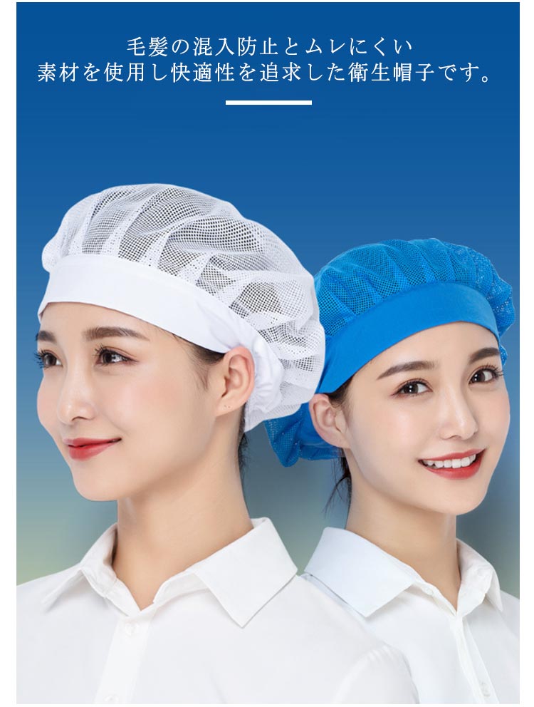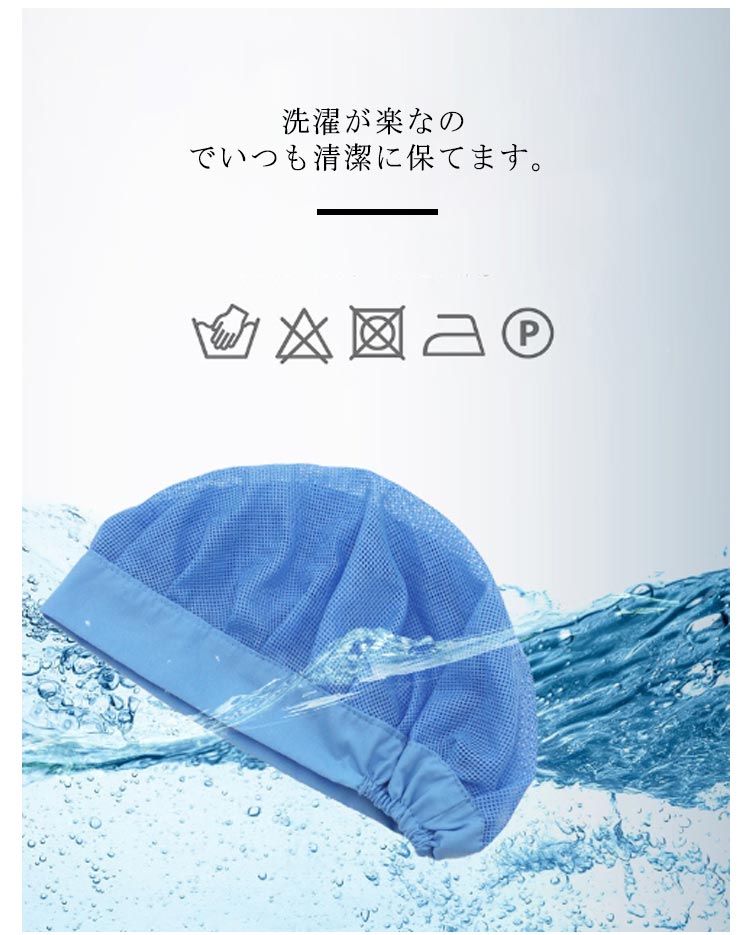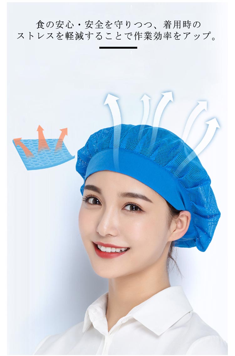 【3枚セット】 通気性に優れ、優しい肌触り。帽子がメッシュになっていて涼しく快適。毛髪の混入防止とムレにくい素材を使用し快適性を追求した衛生帽子です。サイド部分にゴムを入れることで、毛髪にフィットしてしっかりと覆い、異物混入を防ぎます。食の安心・安全を守りつつ、着用時のストレスを軽減することで作業効率をアップ。洗濯が楽なのでいつも清潔に保てます。食品工場だけでなく厨房でのご使用もおすすめ。【ここでよく使われま】食品工場 給食センター 給食室 パン工場 菓子工場 食品加工 水産加工 スーパー バックヤード 魚市場 卸売市場 鮮魚店 精肉店 惣菜調理 衛生管理者 実験室 工場見学 厨房 検品作業