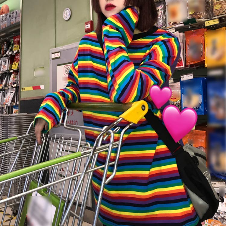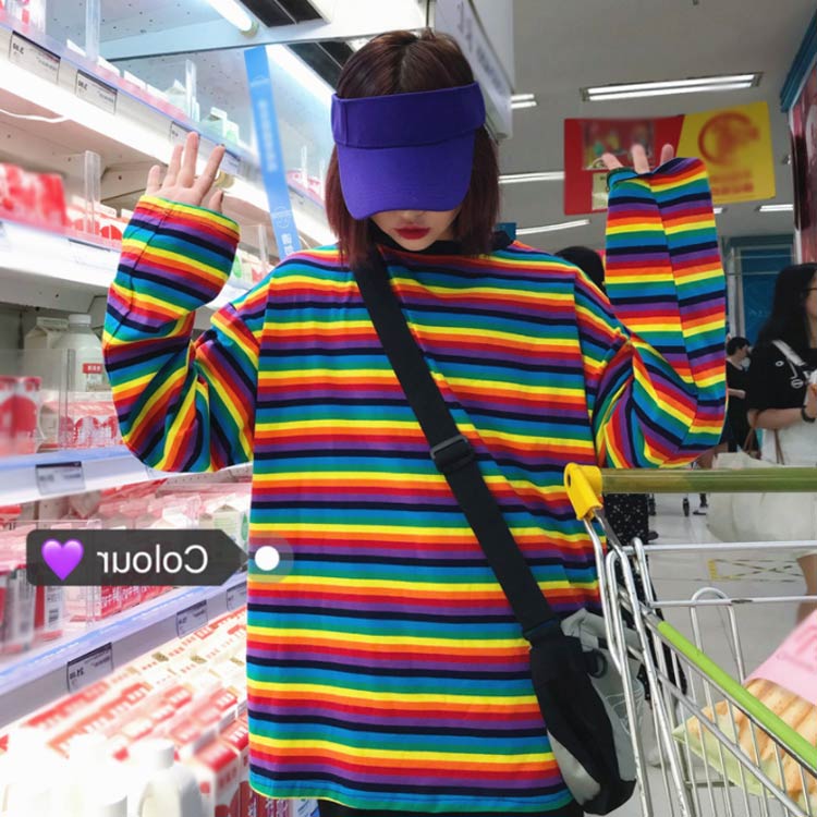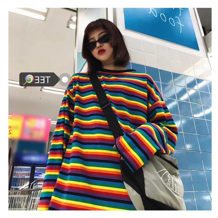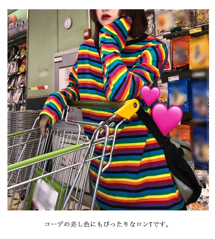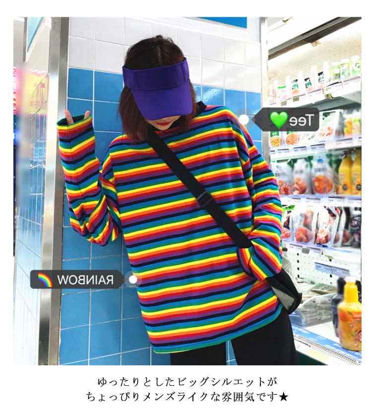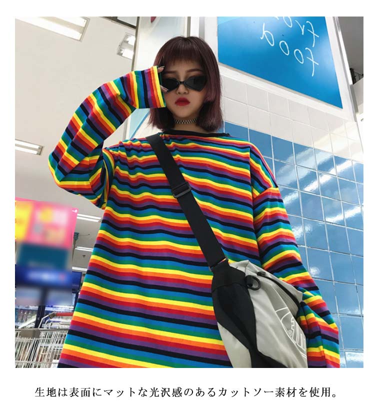 送料無料 Tシャツ カットソー 長袖 レインボー マルチボーダー柄 カラフル ゆったり トップス ダンス 衣装 ヒップホップ 韓国ファッション 個性的 服 原宿系