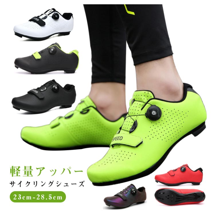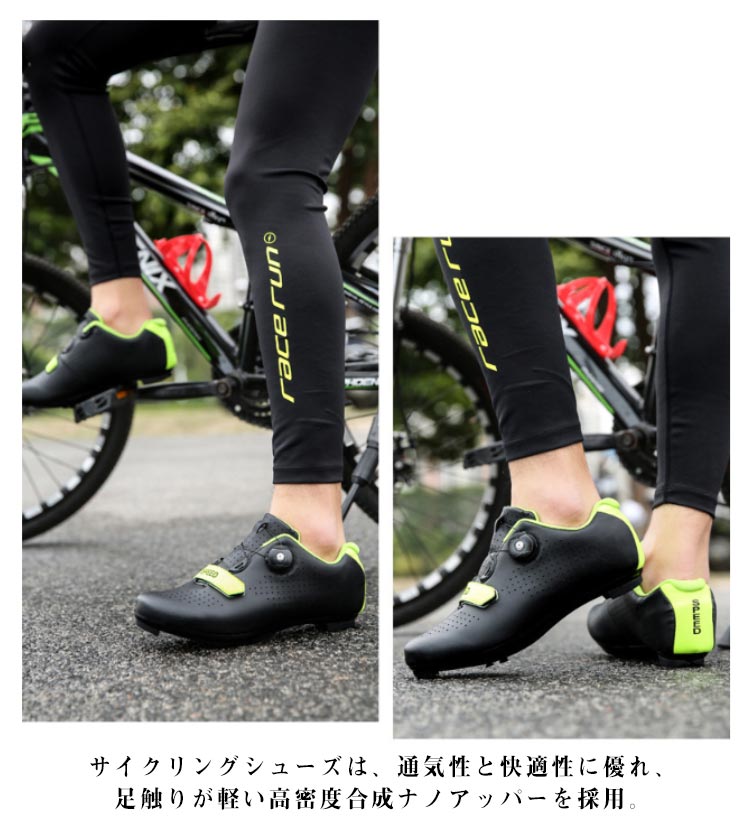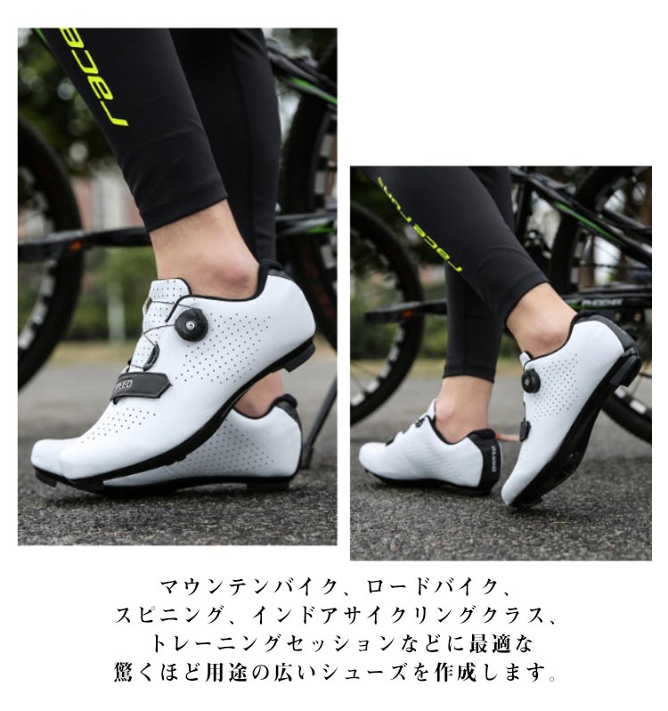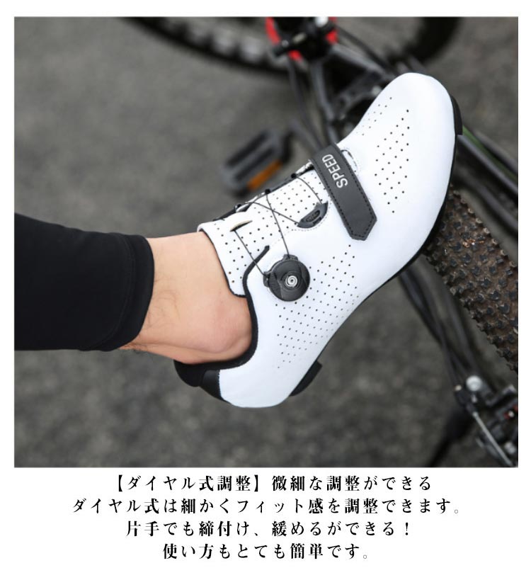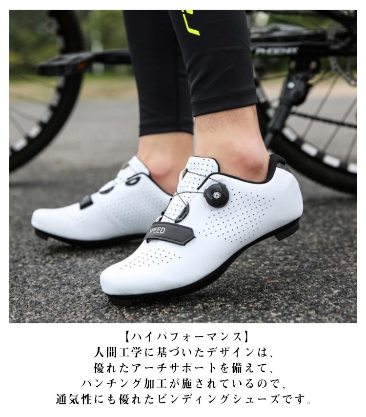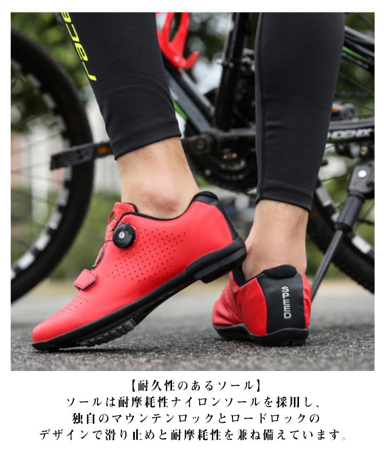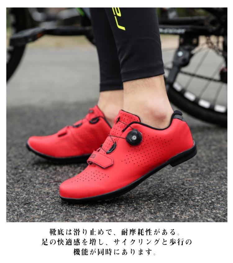 サイクリングシューズ 23cm-28.5cm【軽量アッパー】サイクリングシューズは、通気性と快適性に優れ、足触りが軽い高密度合成ナノアッパーを採用。【耐久性のあるソール】ソールは耐摩耗性ナイロンソールを採用し、独自のマウンテンロックとロードロックのデザインで滑り止めと耐摩耗性を兼ね備えています。【システム互換性】マウンテンバイク、ビンディングバイク、ロードバイク、インドアバイク、マウンテンバイク、サイクルバイクに適しています。サイクリングシューズはユニセックスで。【ハイパフォーマンス】人間工学に基づいたデザインは、優れたアーチサポートを備えて、パンチング加工が施されているので、通気性にも優れたビンディングシューズです。マウンテンバイク、ロードバイク、スピニング、インドアサイクリングクラス、トレーニングセッションなどに最適な驚くほど用途の広いシューズを作成します。【ダイヤル式調整】微細な調整ができるダイヤル式は細かくフィット感を調整できます。片手でも締付け、緩めるができる!使い方もとても簡単です。靴底は滑り止めで、耐摩耗性がある。足の快適感を増し、サイクリングと歩行の機能が同時にあります。