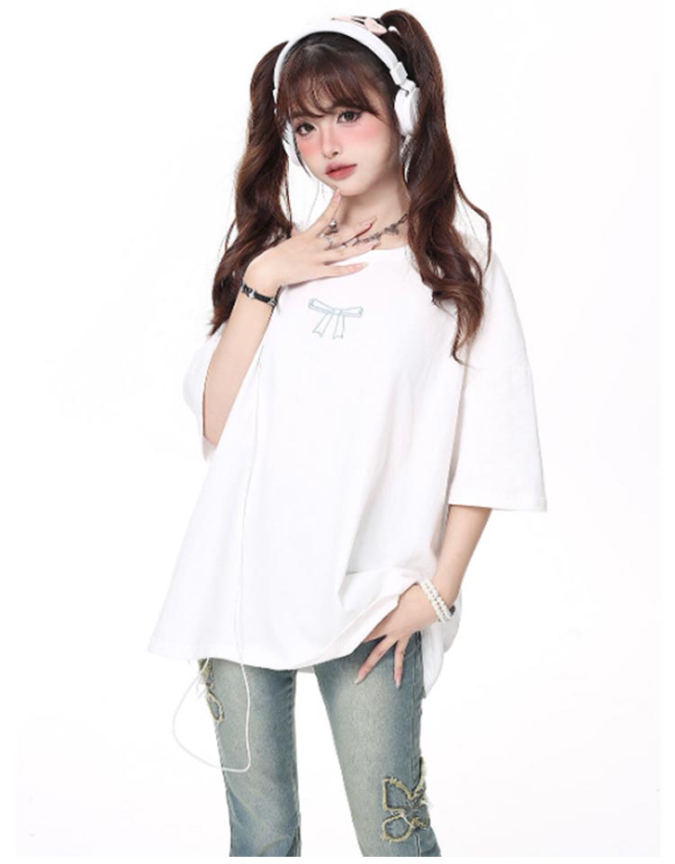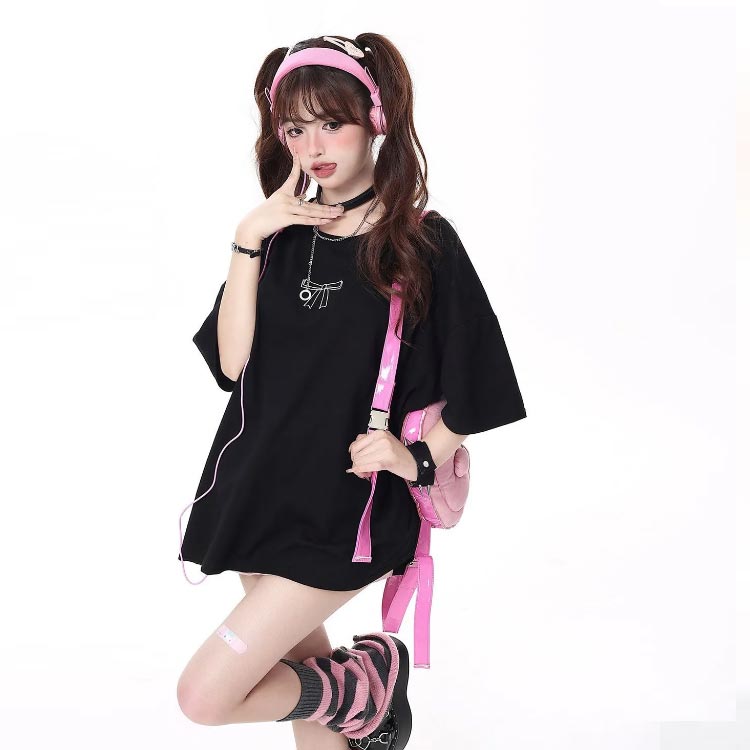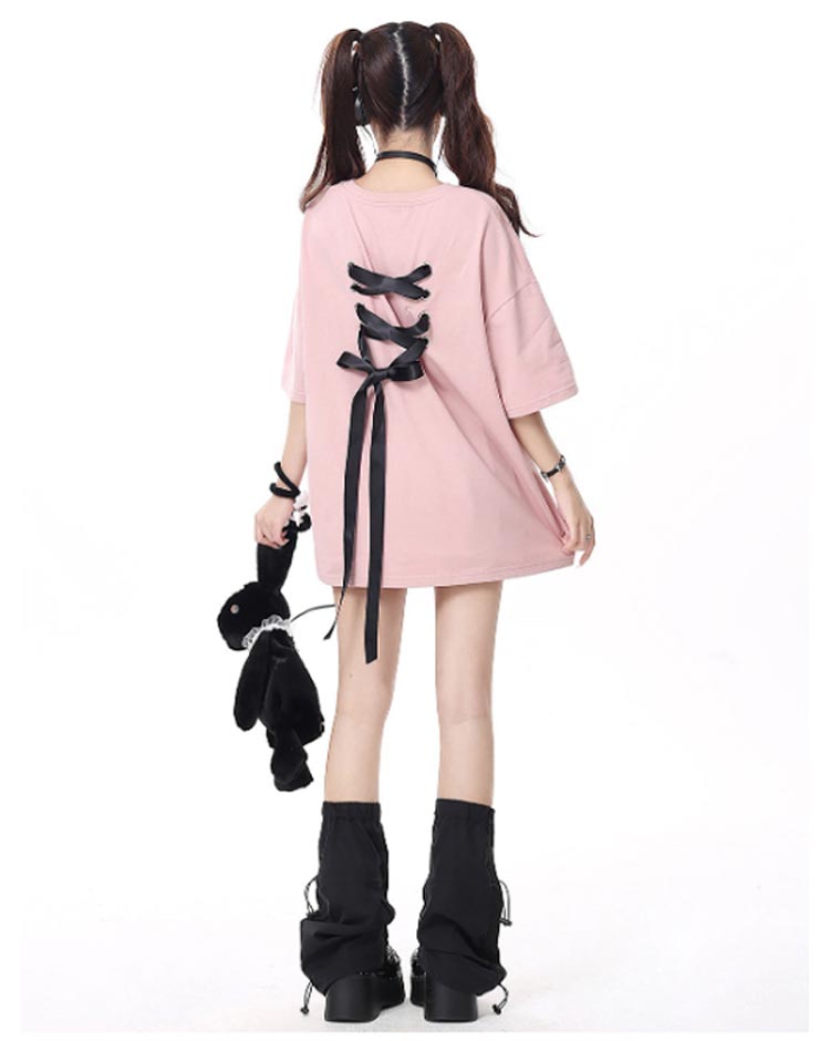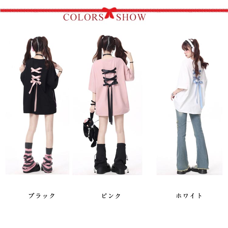 【送料無料】 バックリボン Tシャツ レディース 半袖Tシャツ 綿 コットン オーバーサイズ ゆったり かわいい 地雷系 量産型 服 原宿ファッション 原宿系 サブカル系 ファッション 女子 参戦服 地雷コーデ 病み 韓国ストリート 黒 白 ピンク お揃い ガーリー 春 夏