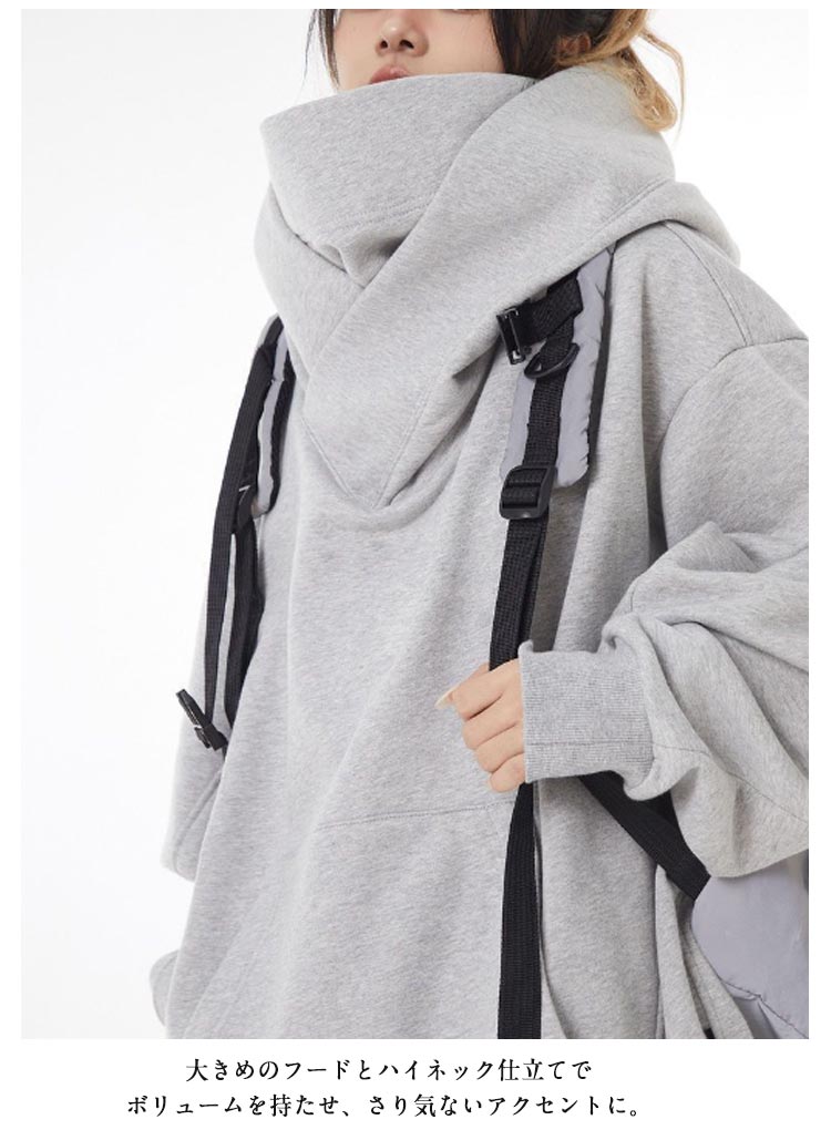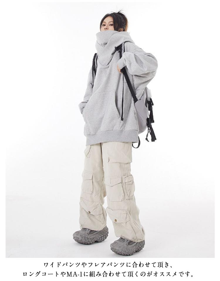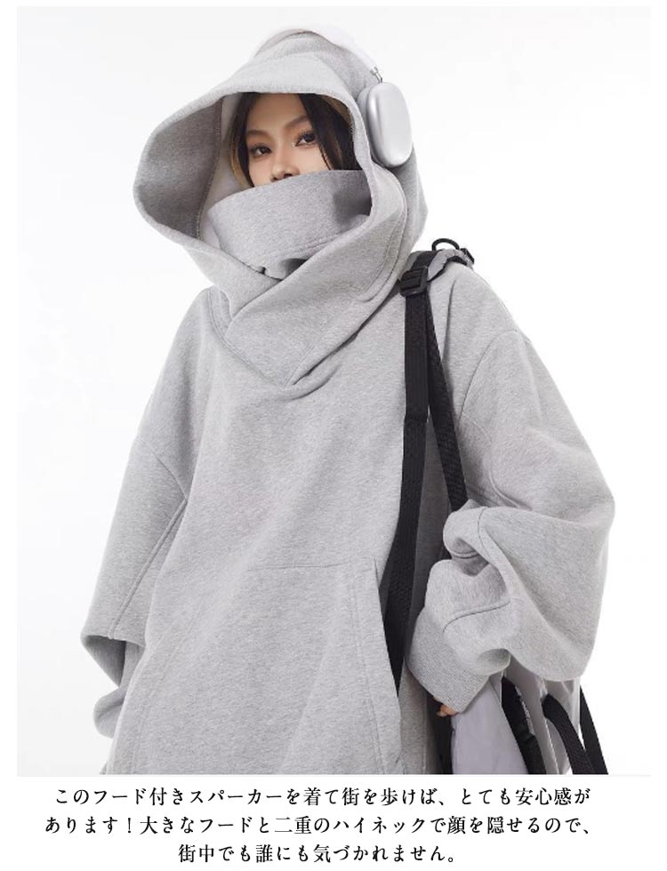 裏起毛と薄手2タイプが選べる!男女兼用!襟元にボリュームを持たせたプルオーバーパーカーが登場。このフード付きスパーカーを着て街を歩けば、とても安心感があります!大きなフードと二重のハイネックで顔を隠せるので、街中でも誰にも気づかれません。大きめのフードとハイネック仕立てでボリュームを持たせ、さり気ないアクセントに。ワイドパンツやフレアパンツに合わせて頂き、ロングコートやMA-1に組み合わせて頂くのがオススメです。一枚でも着て頂けるので、お車での移動や、近くまでお出かけする際にもオススメです。