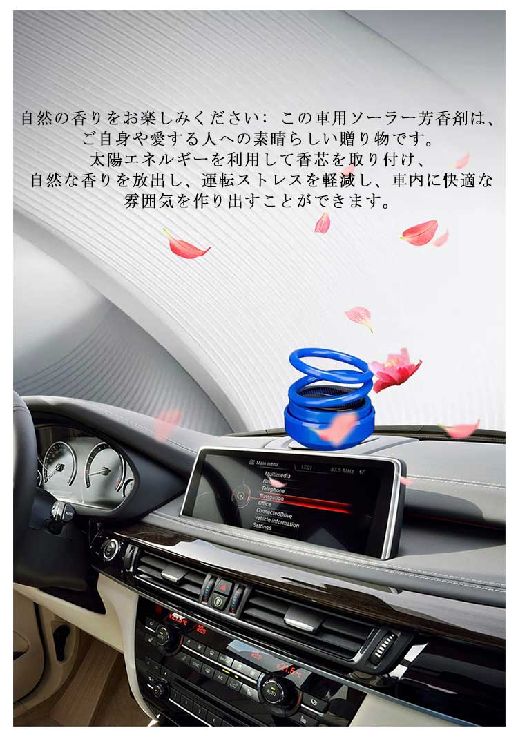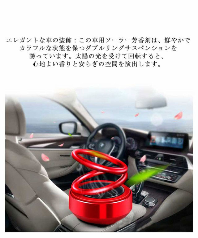 高級な雰囲気:高品質の樹脂素材で作られたこの車用ソーラー芳香剤は、太陽光の下で自動的に回転し、車内に快適でエレガントな雰囲気を作り出します。自然の香りをお楽しみください: この車用ソーラー芳香剤は、ご自身や愛する人への素晴らしい贈り物です。太陽エネルギーを利用して香芯を取り付け、自然な香りを放出し、運転ストレスを軽減し、車内に快適な雰囲気を作り出すことができます。エレガントな車の装飾:この車用ソーラー芳香剤は、鮮やかでカラフルな状態を保つダブルリングサスペンションを誇っています。太陽の光を受けて回転すると、心地よい香りと安らぎの空間を演出します。