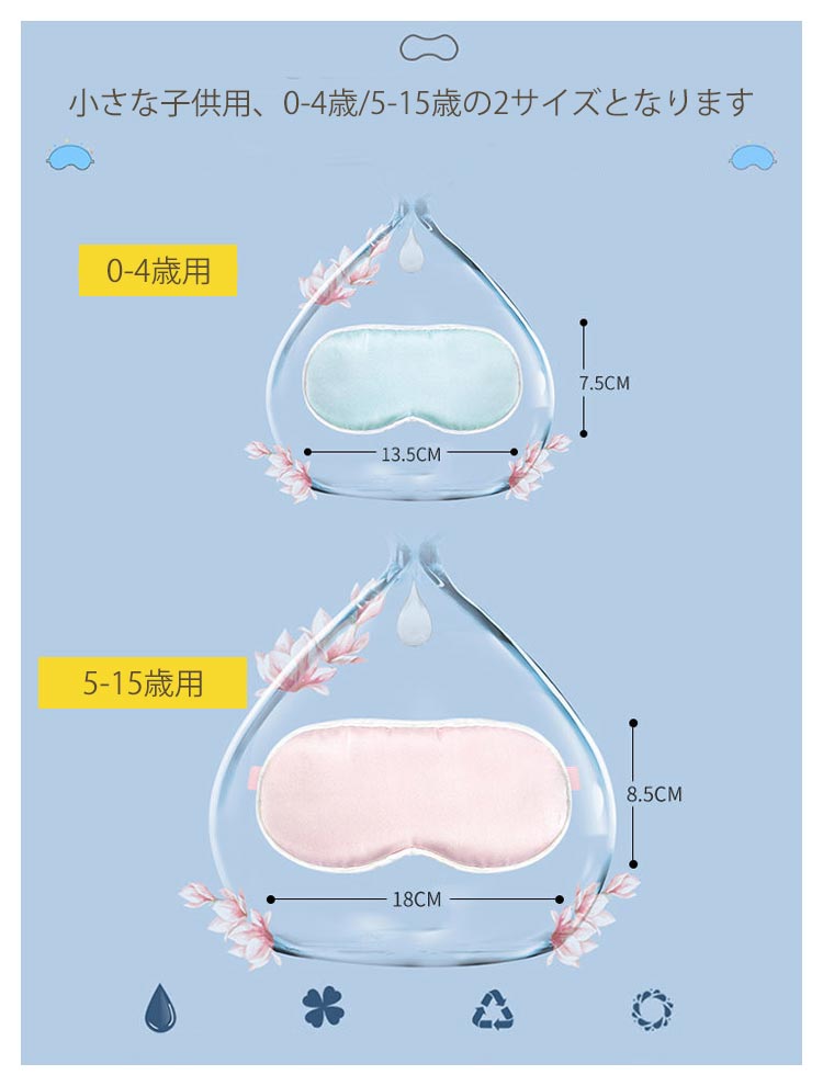 | 子供用シルクアイマスクです。 小さな子供用、0-4歳/5-15歳の2サイズとなります。 アジャスターでゴムバンドの調整ができます。(37-64cm) ※水または30度以下のぬるま湯で、手洗いをしてください。 夏場でも蒸れずにサラッと快適な着け心地です。 ふわふわな中綿で、目元を優しく包み込んでくれます。 就寝中はもちろん、電車や飛行機の機内でも大活躍! | |