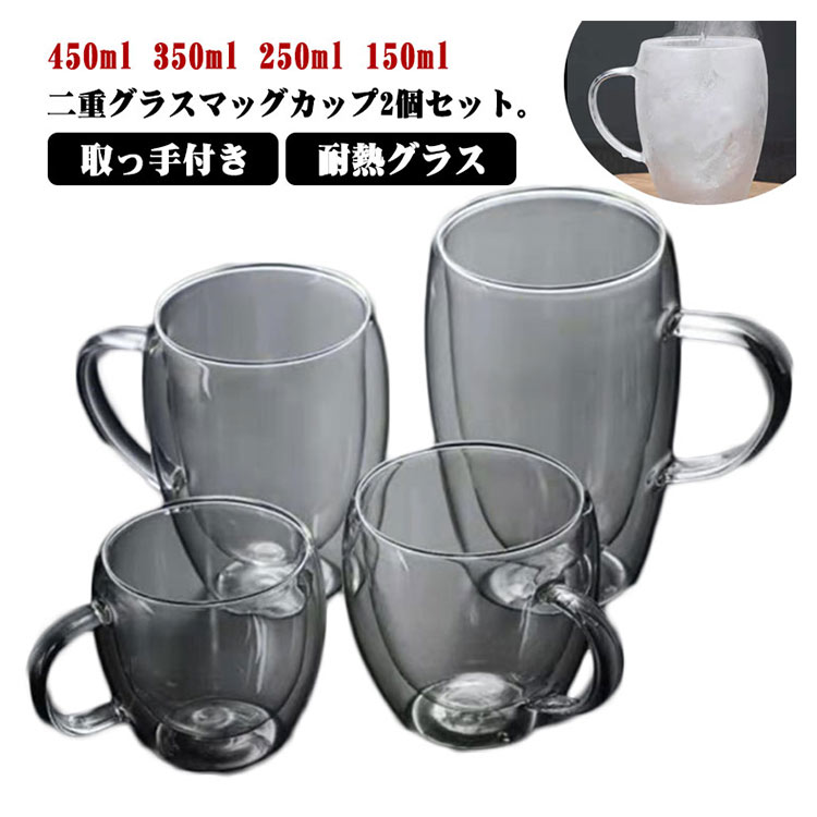 ダブルウォールグラス 2個セット 450ml 350ml 250ml 150ml マグカップ 取っ手付き かわいい クリア 耐熱グラス 保温 保冷 二重グラス 真空断熱 お茶 コーヒー お酒 ビール 北欧 食器 洗いやすい お祝い 敬老の日 誕生日 ギフト 送料無料