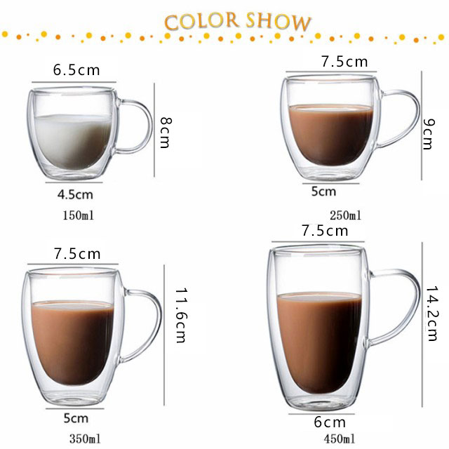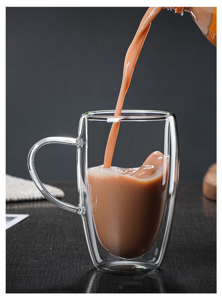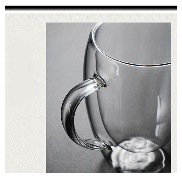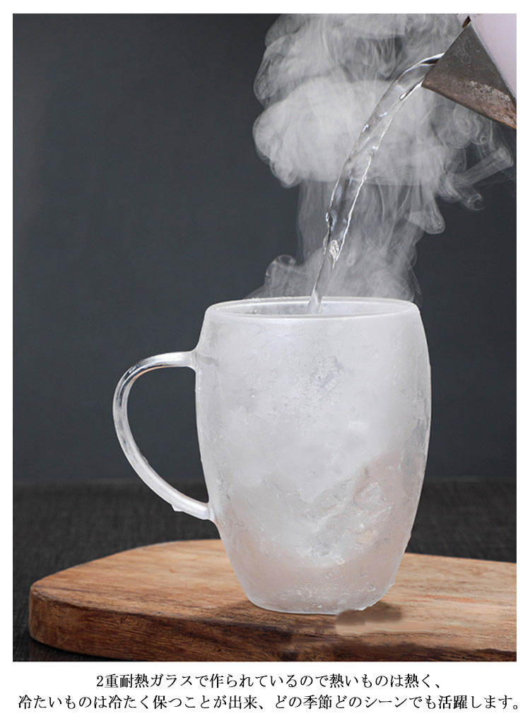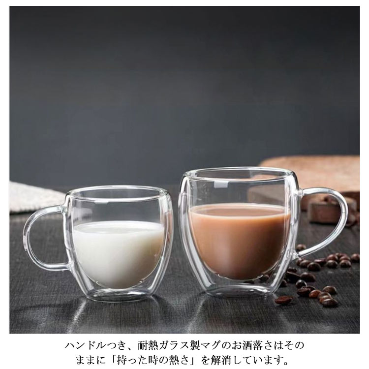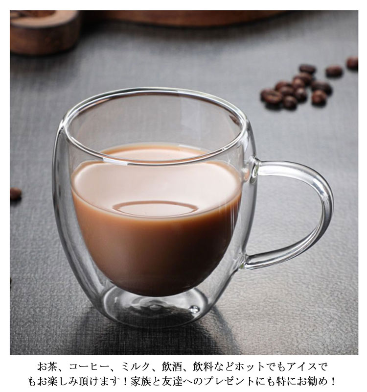 | 二重グラスマッグカップ2個セット。 2重耐熱ガラスで作られているので熱いものは熱く、冷たいものは冷たく保つことが出来、どの季節どのシーンでも活躍します。 ハンドルつき、耐熱ガラス製マグのお洒落さはそのままに「持った時の熱さ」を解消しています。 お茶、コーヒー、ミルク、飲酒、飲料などホットでもアイスでもお楽しみ頂けます!家族と友達へのプレゼントにも特にお勧め! | |