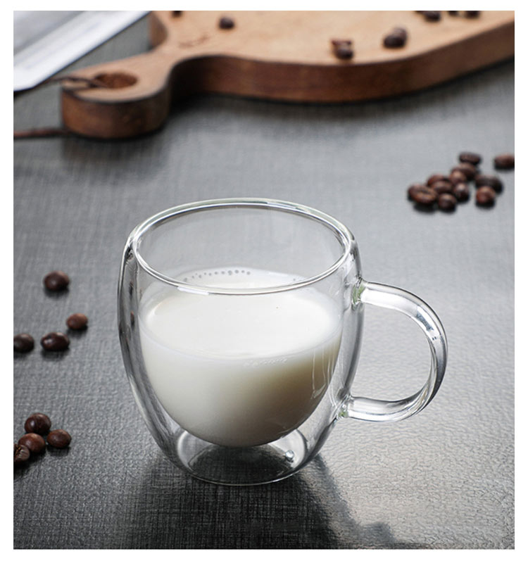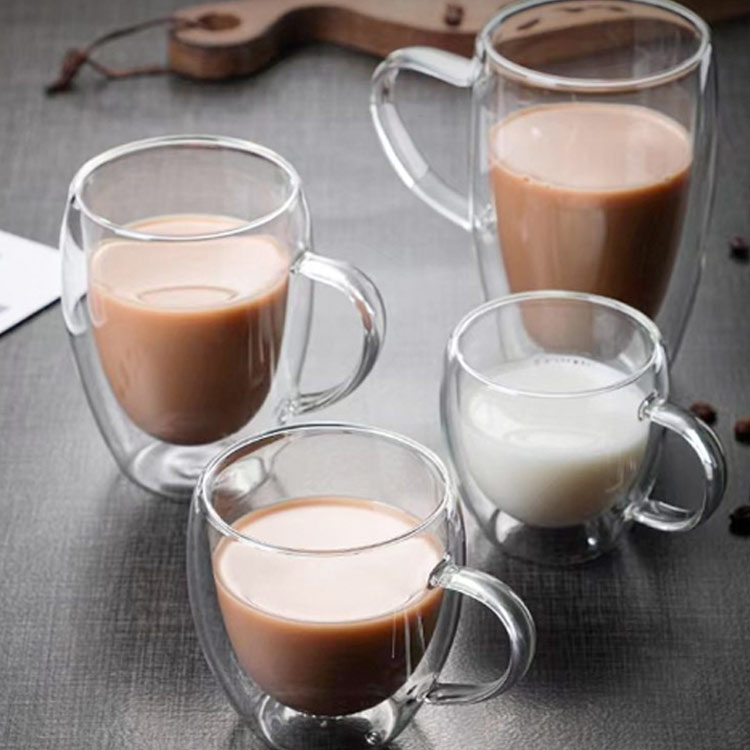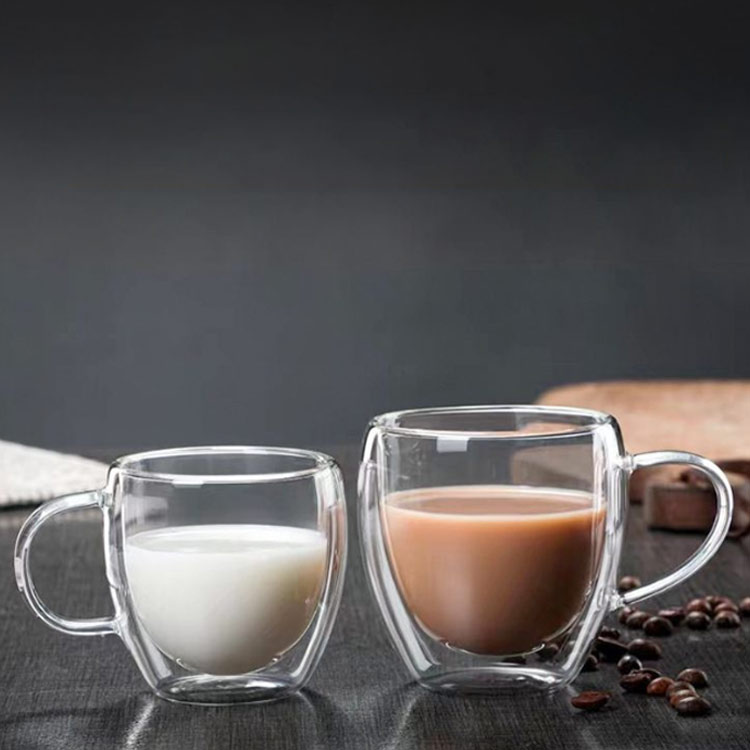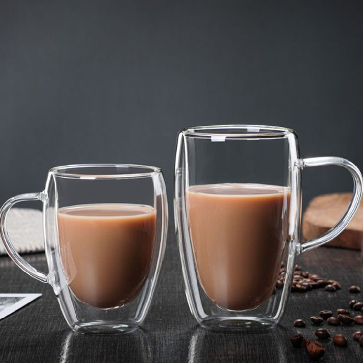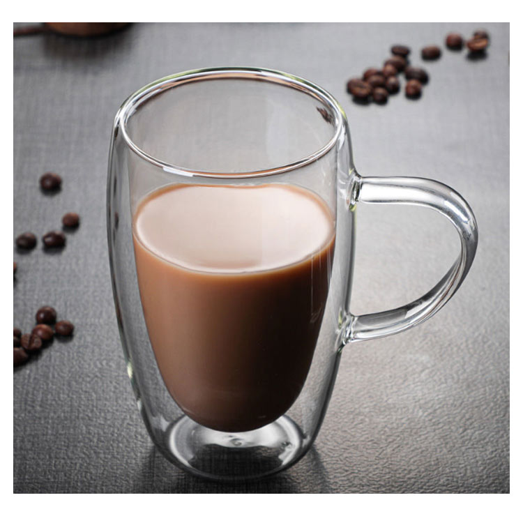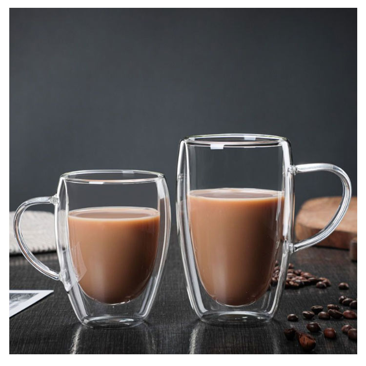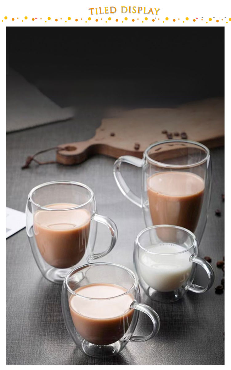 | 二重グラスマッグカップ2個セット。 2重耐熱ガラスで作られているので熱いものは熱く、冷たいものは冷たく保つことが出来、どの季節どのシーンでも活躍します。 ハンドルつき、耐熱ガラス製マグのお洒落さはそのままに「持った時の熱さ」を解消しています。 お茶、コーヒー、ミルク、飲酒、飲料などホットでもアイスでもお楽しみ頂けます!家族と友達へのプレゼントにも特にお勧め! | |