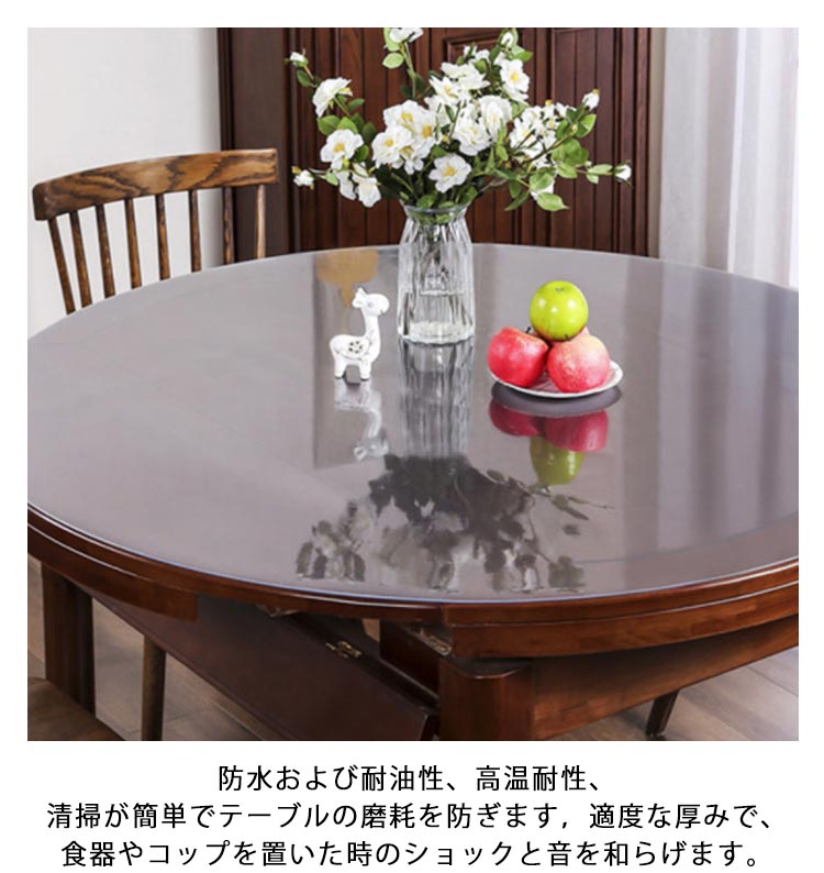 【厚1.5mm】【直径110cm/120cm/125cm/130cm/135cm/140cm】【透明ビニールPVC製】【耐熱·耐油·防水】高透明度で家具本来の見栄えながらテーブルの汚れ・キズを防ぐ円形テーブルクロス高品質なポリ塩化ビニール材料を採用し、環境に優しい。防水および耐油性、高温耐性、清掃が簡単でテーブルの磨耗を防ぎます,適度な厚みで、食器やコップを置いた時のショックと音を和らげます。透明だからお好きな色のテーブルクロスを下に敷いて合わせてもお洒落。透明度が高く、家具本来の見栄えに近い状態での使用が可能です。撥水性がある素材なので汚れもすぐ拭き取ることができます。洗濯不要で、お手軽に使用できます。安全安心で、食品と直接に接触することができます。