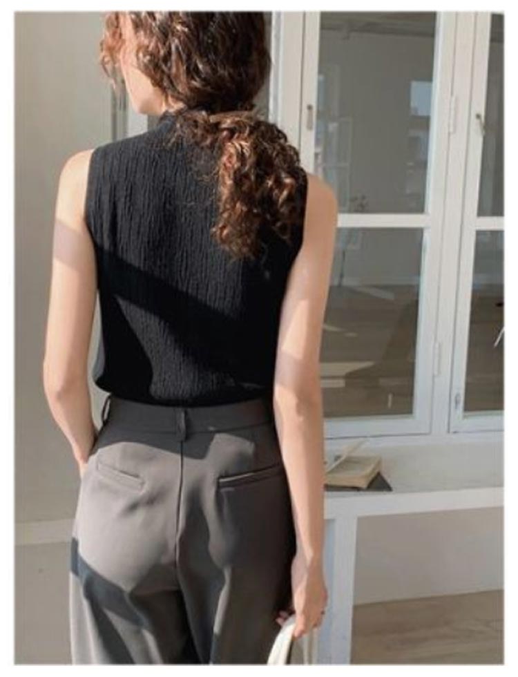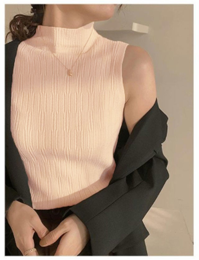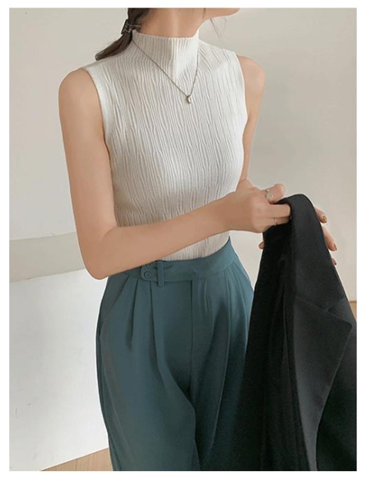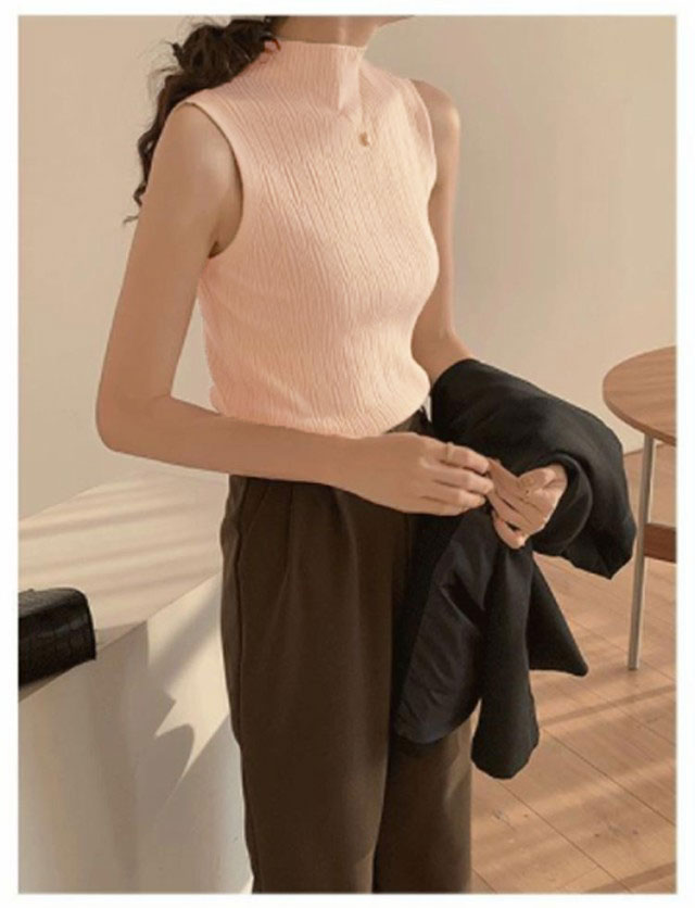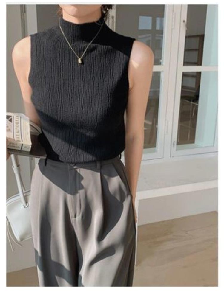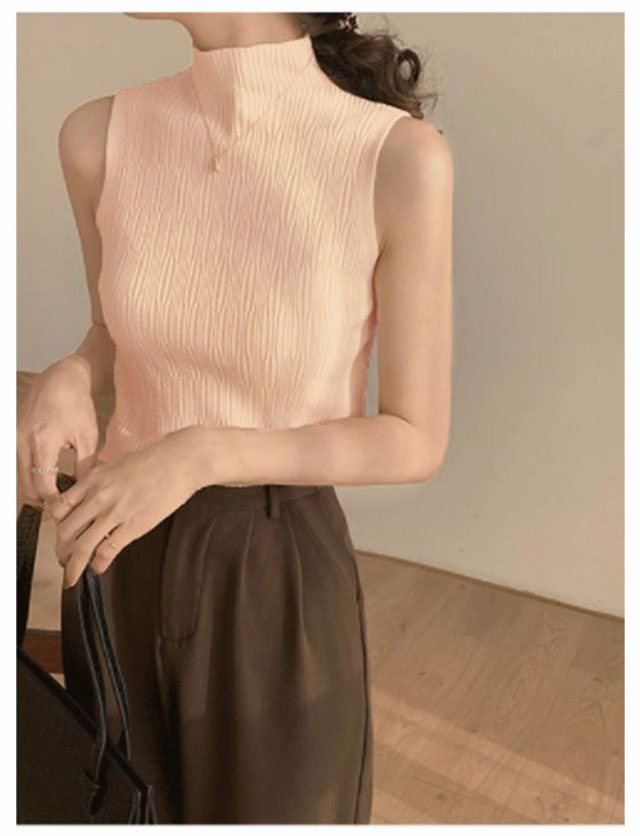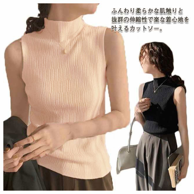 ふんわり柔らかな肌触りと抜群の伸縮性で楽な着心地を叶えるカットソー。ノースリーブのデザインはジャケッ トなどを羽織った際に袖がもたつかず、レイヤードスタイルに最適。コンパクトシルエットでありながら、プリーツの凹凸によってインナーの線や背中のハミ肉が映りにくいところが嬉しい♪控えめなネック高さでタートルネックの窮屈感が苦手な方にもオススメです。メインで着たり、レイヤードしたりとオールシーズン着用が可能です。