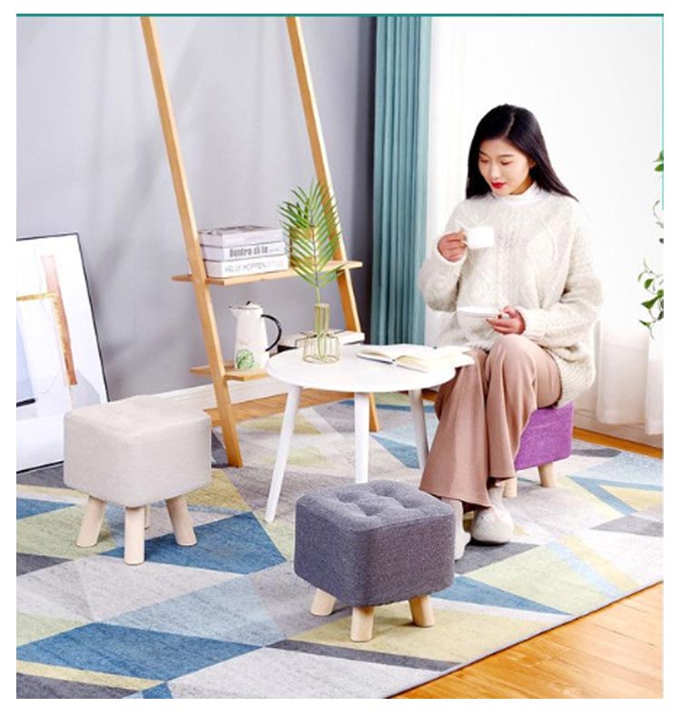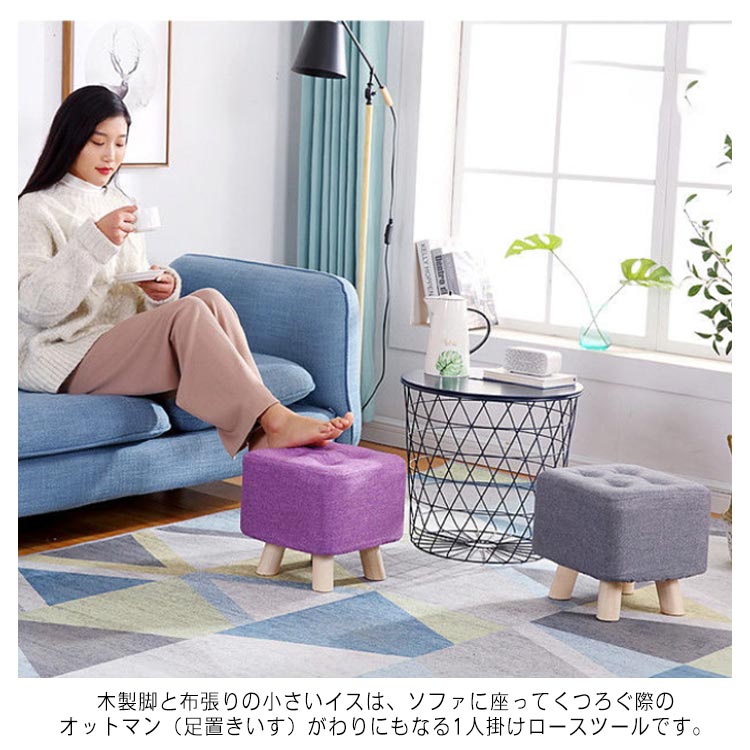 リビングや寝室、玄関にちょこんと置いて使える♪木製スツール。木製脚と布張りの小さいイスは、ソファに座ってくつろぐ際のオットマン(足置きいす)がわりにもなる1人掛けロースツールです。耐重150kgで大人もOKのオシャレなミニスツール。サラっとしたカバーは外して洗えます。木製の脚の底には傷防止と滑り止めが付いています。省スペースで狭い空間でも邪魔にならない大きさだから家具をたくさん置けない一人暮らしのワンルームにも最適です。コロンとしたフォルムの多機能スツールは弾力があってふかふかの座り心地。通気性のよいサラサラの綿麻素材でオールシーズンお使いいただけます。