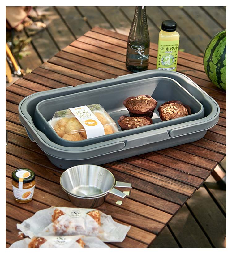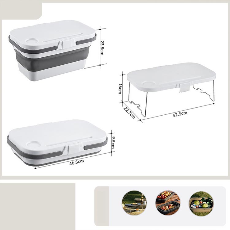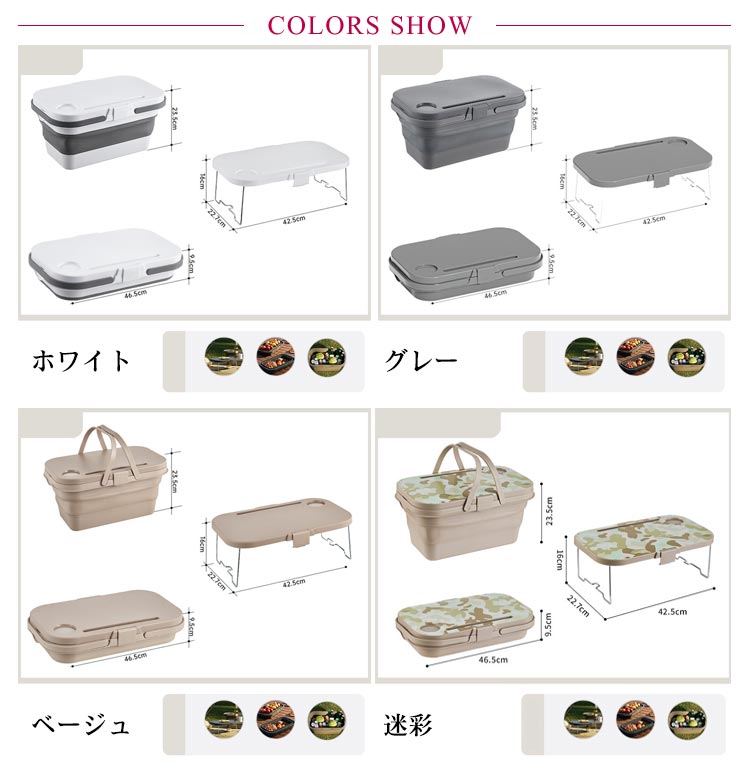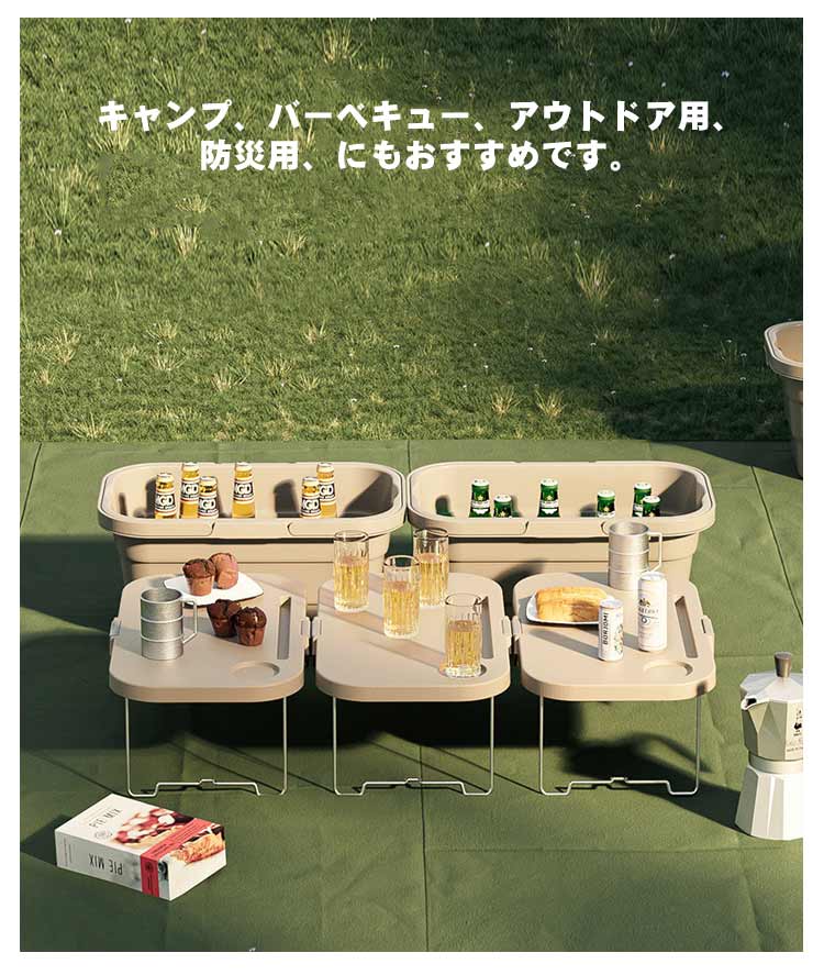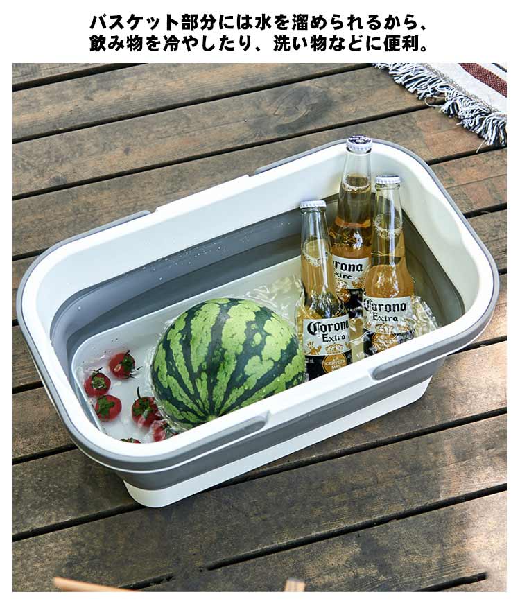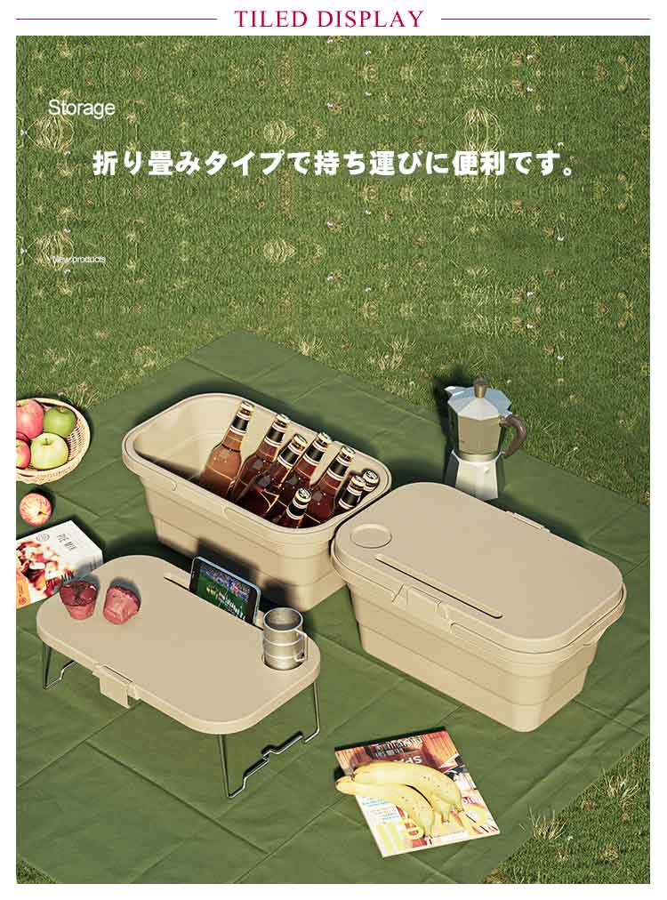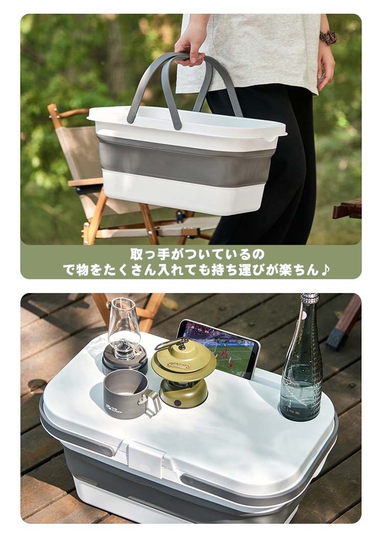 | テーブルにもなるし、収納にも困らない! 折り畳みタイプで持ち運びに便利です。 蓋は小さなテーブルとして使用可能です。 この一つでバスケット?テーブル?トレーとしてお使いいただけます。 折りたたむと厚さ約9.5cmになるので使わない時も安心☆ 取っ手がついているので物をたくさん入れても持ち運びが楽ちん? バスケット部分には水を溜められるから、飲み物を冷やしたり、洗い物などに便利。 キャンプ バーベキュー アウトドア用 防災用 にもおすすめです。 | |