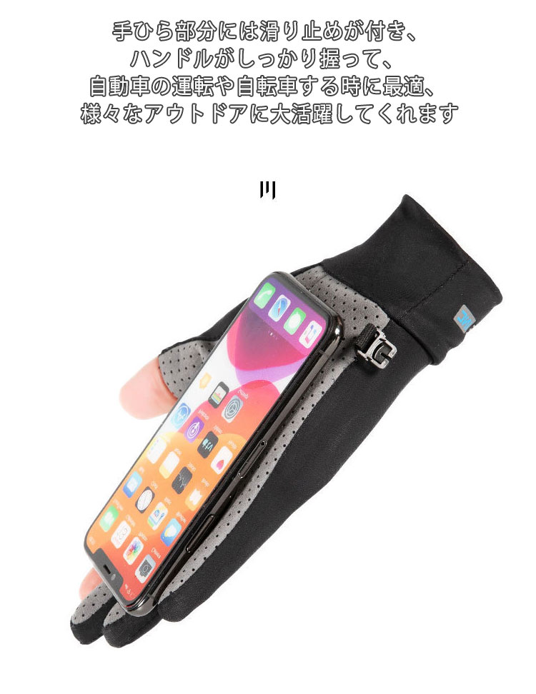 | 2タイプ選べる!サマーに最適の冷感グローブです。 薄手の生地と、手のひらがメッシュになった涼しい使用感の手袋で、ムレにくく涼しく快適です。 紫外線が気になる時にサッとつけるだけ、紫外線から日灼けしやすい手を保護できます。 吸湿性、放湿性も優れているので、蒸れなくサラサラとしたつけ心地で夏でも快適ご使用いただけます。 優れた伸縮性&高弾力、柔らかく快適で、手にフィットし、ソフトな肌触りがあります。 手ひら部分には滑り止めが付き、ハンドルがしっかり握って、自動車の運転や自転車する時に最適、様々なアウトドアに大活躍してくれます。 グローブを着用したままスマートフォンやタブレットPC等の操作も可能です。 | |