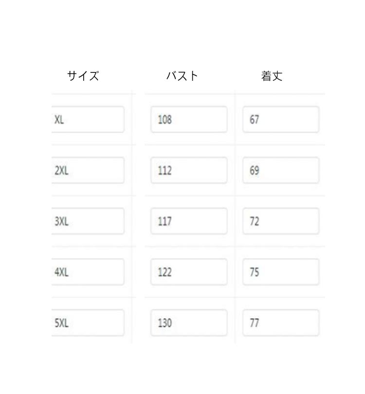 | サイズ | XL 2XL 3XL 4XL 5XL |