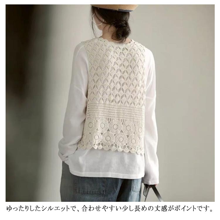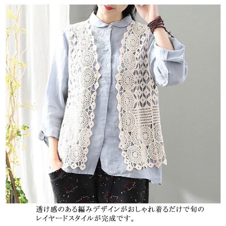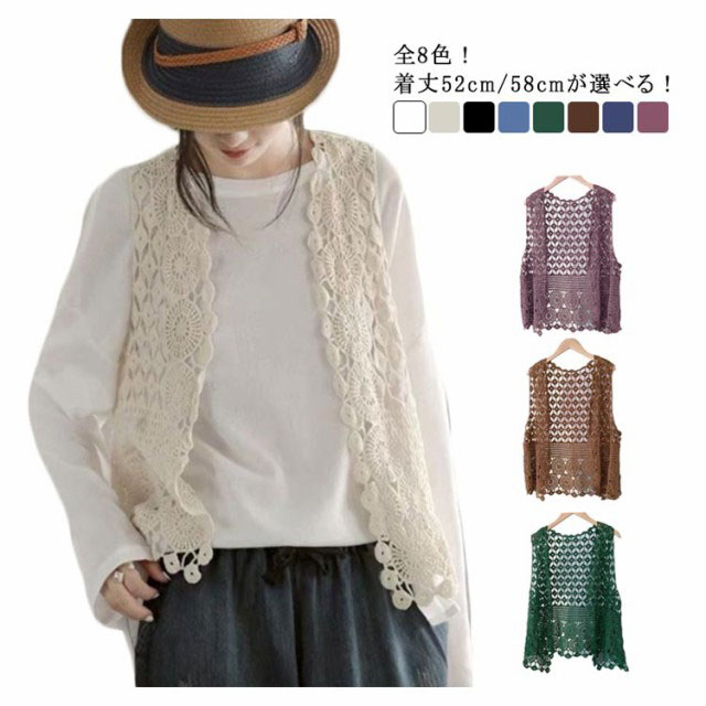 全8色!着丈52cm/58cmが選べる!レース素材で透け感を楽しめる前開きベスト。通気性に優れた薄手生地で夏でもリラックスな着心地。ゆったりしたシルエットで、合わせやすい少し長めの丈感がポイントです。透け感のある編みデザインがおしゃれ着るだけで旬のレイヤードスタイルが完成です。