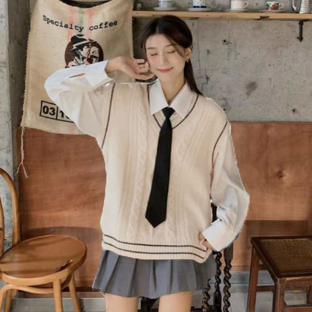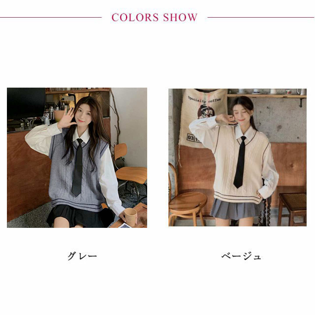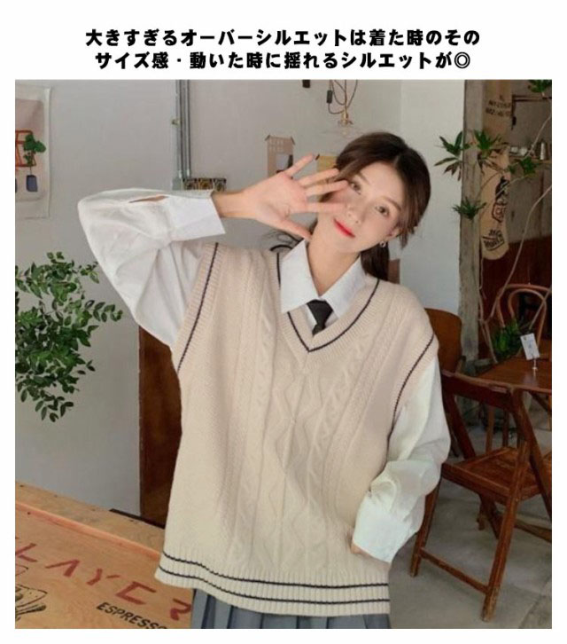 配色ライン+フロント部分に入ったケーブル編みがポイント。ニットベスト。大きすぎるオーバーシルエットは着た時のそのサイズ感・動いた時に揺れるシルエットが◎襟がきれいに見える計算されたライン入りVネックデザイン。長袖スクールシャツの組み合わせて、シャツのカラーを変えるだけでイメージが変わります。年齢を選ばず、学生・女子高生の制服にも、普段使いにもお使いいただけます !