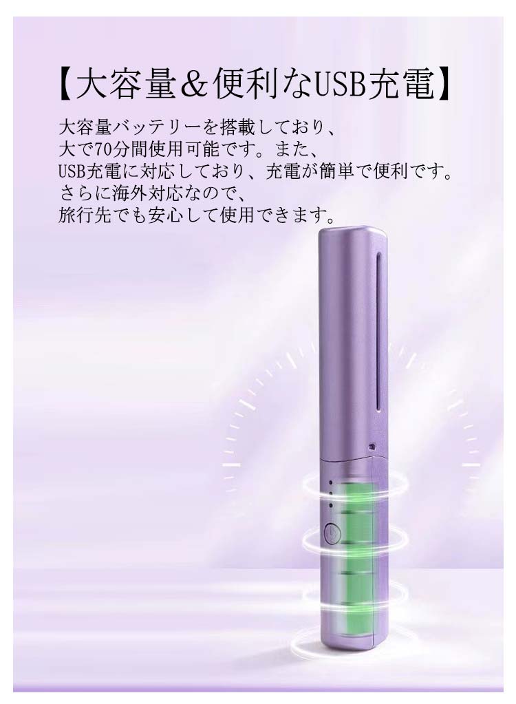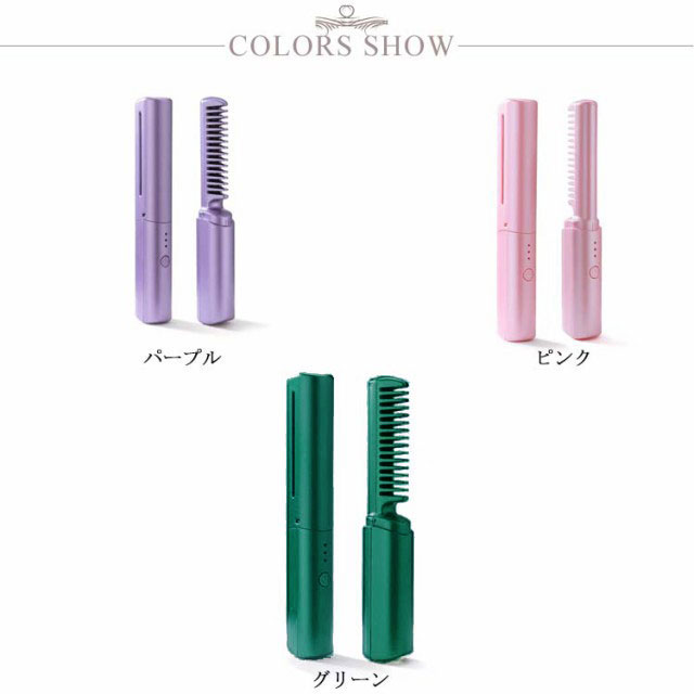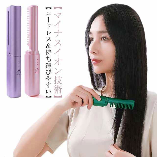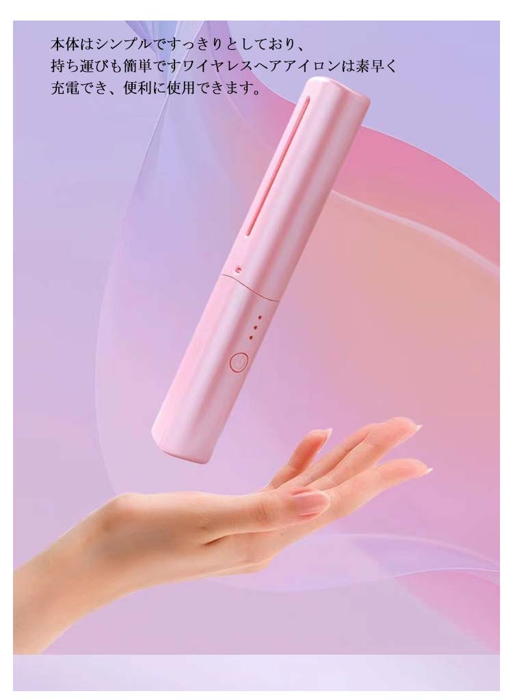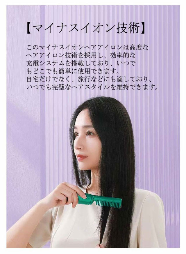 【良質な材質】PTC材料を用いて製造し、耐久性があり、変形せず、歯が抜けない、断熱櫛歯+断熱ハウジング、二重保障。3段階の温度調節があり、リンスセラミックコーティングが含まれており、使用中に髪質を傷つけることはありません。【大容量&便利なUSB充電】大容量バッテリーを搭載しており、大で70分間使用可能です。また、USB充電に対応しており、充電が簡単で便利です。さらに海外対応なので、旅行先でも安心して使用できます。【コードレス&持ち運びやすい】ポータブル縮毛矯正ブラシはコードレスで使いやすいです。縮毛矯正やカールの際にワイヤーが絡む心配がありません。本体はシンプルですっきりとしており、持ち運びも簡単ですワイヤレスヘアアイロンは素早く充電でき、便利に使用できます。【マイナスイオン技術】このマイナスイオンヘアアイロンは高度なヘアアイロン技術を採用し、効率的な充電システムを搭載しており、いつでもどこでも簡単に使用できます。 自宅だけでなく、旅行などにも適しており、いつでも完璧なヘアスタイルを維持できます。【操作簡単】電源投入後3~5分で使用可能。16個の櫛歯科学列はすべて均一に列を包み、特質コーティングを施し、髪を均一に熱を受けさせ、引っ張らずに髪を詰まらせない。