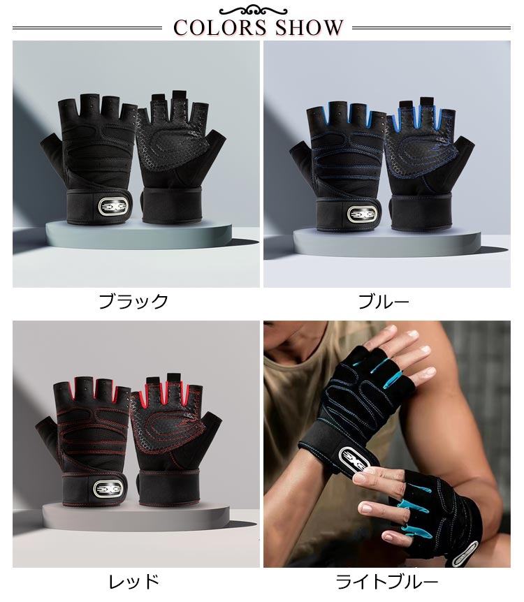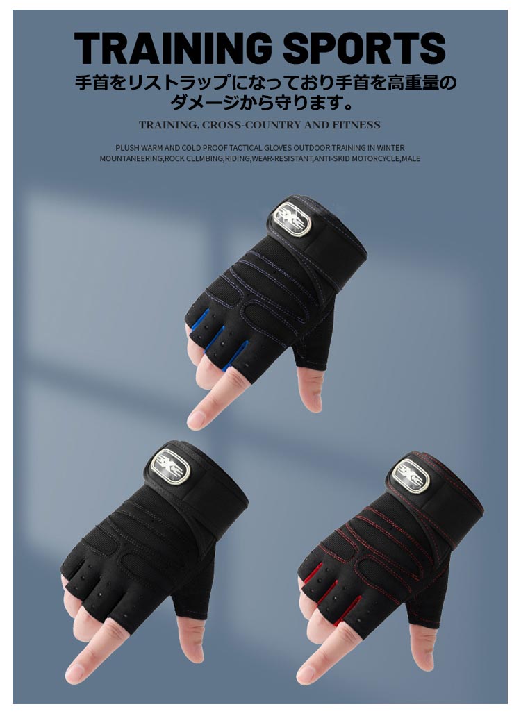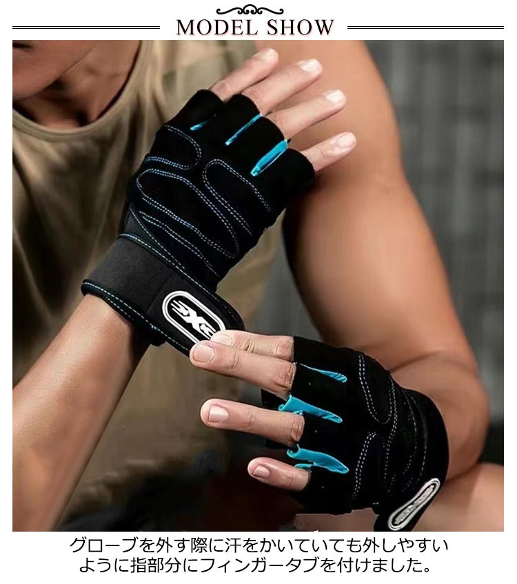トレーニンググローブ 4COLOR手の甲部分は通気性の高い素材を使用しておりますので湿気を逃し快適な使い心地ですグローブを外す際に汗をかいていても外しやすいように指部分にフィンガータブを付けました手首をリストラップになっており手首を高重量のダメージから守ります手のひら部分には高重量のバーベルなどでも滑りにくく、耐久性に特化した素材を使用安心感が違います