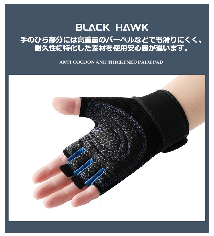 | トレーニンググローブ 4COLOR 手の甲部分は通気性の高い素材を使用しておりますので湿気を逃し快適な使い心地です グローブを外す際に汗をかいていても外しやすいように指部分にフィンガータブを付けました 手首をリストラップになっており手首を高重量のダメージから守ります 手のひら部分には高重量のバーベルなどでも滑りにくく、耐久性に特化した素材を使用安心感が違います | |