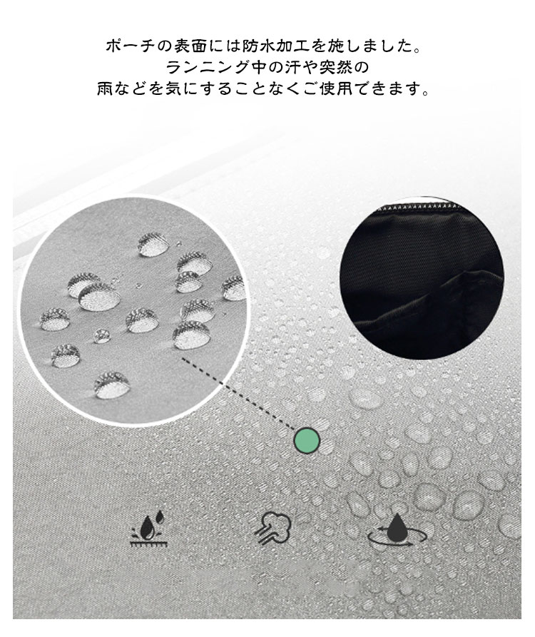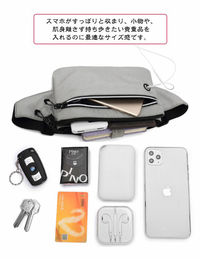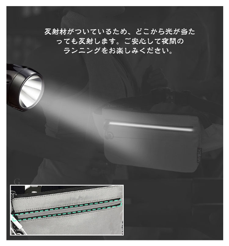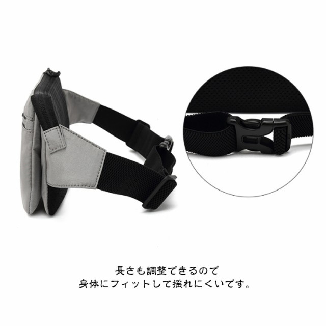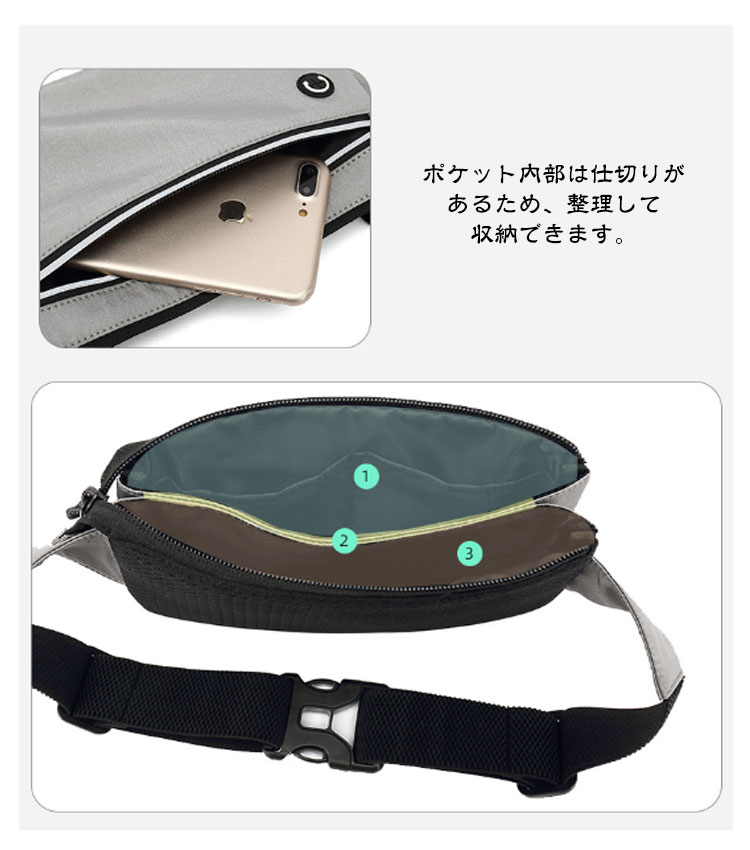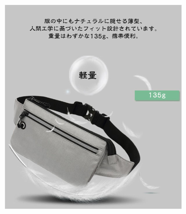 超薄型!超軽量!大容量ウエストポーチスマホがすっぽりと収まり、小物や、肌身離さず持ち歩きたい貴重品を入れるのに最適なサイズ感です。ポケット内部は仕切りがあるため、整理して収納できます。服の中にもナチュラルに隠せる薄型、人間エ学に基づいたフィット設計されています。重量はわずかな135g、携帯便利。長さも調整できるので身体にフィットして揺れにくいです。ポーチの表面には防水加工を施しました。ランニング中の汗や突然の雨などを気にすることなくご使用できます。背中にあたる面は、通気性のあるメッシュ素材を使用。ランニング中やウォーキング中も体に接している部分が蒸れることなく快適です。飽きのこないシンプルなデザインのランニングポーチ。ユニセックスデザインで女性でも男性でもお使いいただけます。反射材がついているため、どこから光が当たっても反射します。ご安心して夜間のランニングをお楽しみください。ランニング、ジョギングやウォーキング、マラソンやジム、アウトドアなどあらゆる用途に対応できます。また普段使いやファッションアイテムのボディバッグとしても◎