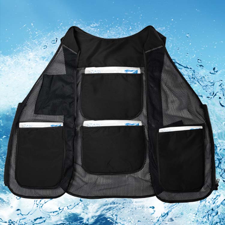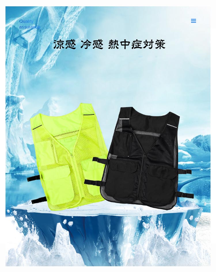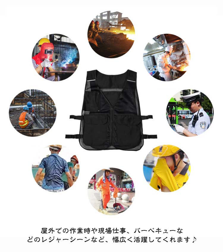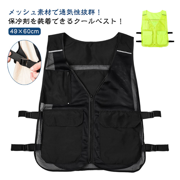 メッシュ素材で通気性抜群!保冷剤を装着できるクールベスト!アルミ素材で保冷効果のある内ポケットを背中に2つ、左右に1つずつ配置!お手持ちの保冷剤を4つまで装着いただけます!外側にもポケットを3つ配置し、小物の収納に便利◎前面はフルジップ仕様で、サイドのベルトでサイズを自由に調節可能!屋外での作業時や現場仕事、バーベキューなどのレジャーシーンなど、幅広く活躍してくれます♪