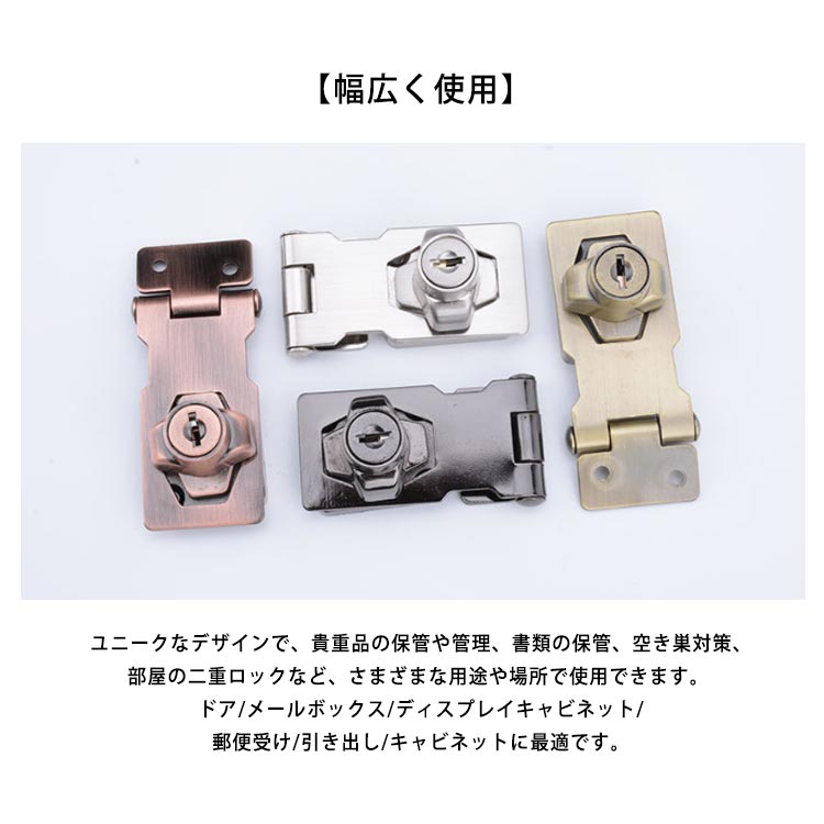 取り付け・取り外しが簡単、ネジ止めで誰でも簡単にDIY可能、鍵でロックが開閉可能、軽量・コンパクトな鍵で持ち運びも可能です。【幅広く使用】:ユニークなデザインで、貴重品の保管や管理、書類の保管、空き巣対策、部屋の二重ロックなど、さまざまな用途や場所で使用できます。 ドア/メールボックス/ディスプレイキャビネット/郵便受け/引き出し/キャビネットに最適です。【防犯】ロック位置のバックルがネジを覆い、硬い物体がロックヘッドをこじ開けるのを効果的に防ぎ、物体が盗まれたり取り出されたりしないようにします。【 頑丈しっかり】ドアロックはクロムメッキ鋼材で作られています、ロックシリンダーは亜鉛合金鋳物、強度が強く、耐久性がアップし長寿命がなっています。【ドアラッチ+南京錠】ドアラッチ南京錠一体型です。引き戸、開き戸などのドアの留め金具としてご利用いただけます。ステンレス製なので、頑丈で品質も良く、サビなどにも強い構造となっております。