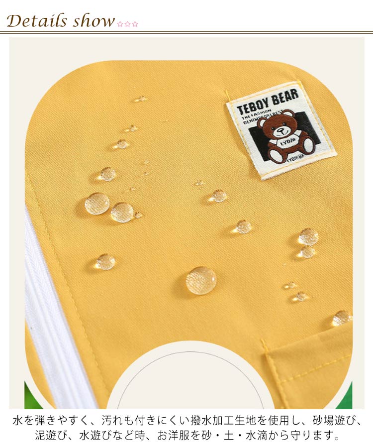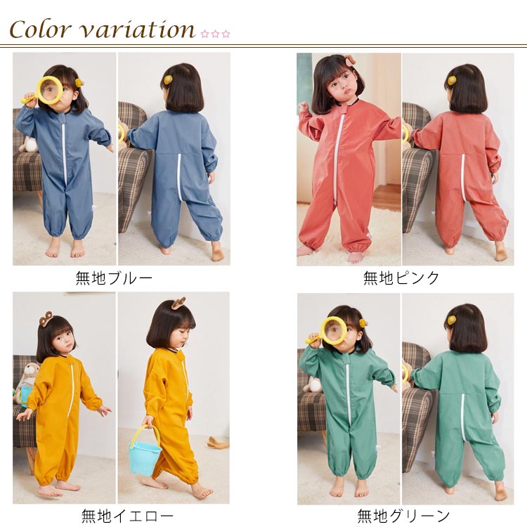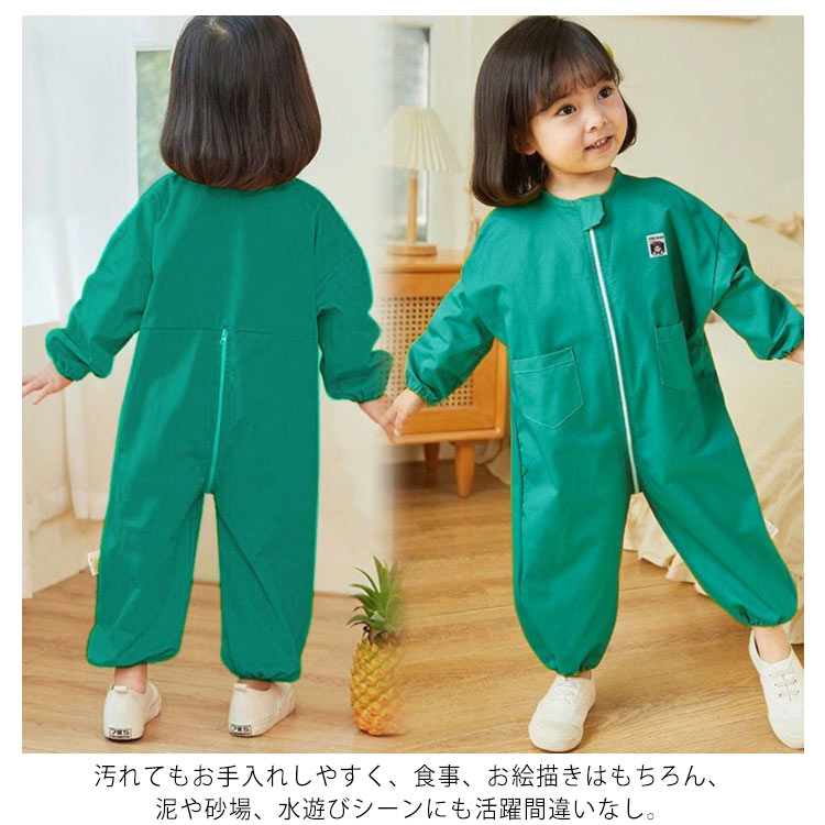 | 80-120cm!お洋服の汚れを気にせずたくさん遊べるオーバーオールタイププレイウェア。 袖口&裾口がゴム仕様になって、泥や砂の侵入を防ぐ。 水を弾きやすく、汚れも付きにくい撥水加工生地を使用し、砂場遊び、泥遊び、水遊びなど時、お洋服を砂?土?水滴から守ります。 フロントファスナー仕様でお着替えラクチン? 取扱い簡単な股下ファスナーは立ったままおむつ替えもでき、キッズはトイレもスムーズ。 遊びの前に服の上から着用すればOK。 汚れてもお手入れしやすく、食事、お絵描きはもちろん、泥や砂場、水遊びシーンにも活躍間違いなし。 | |