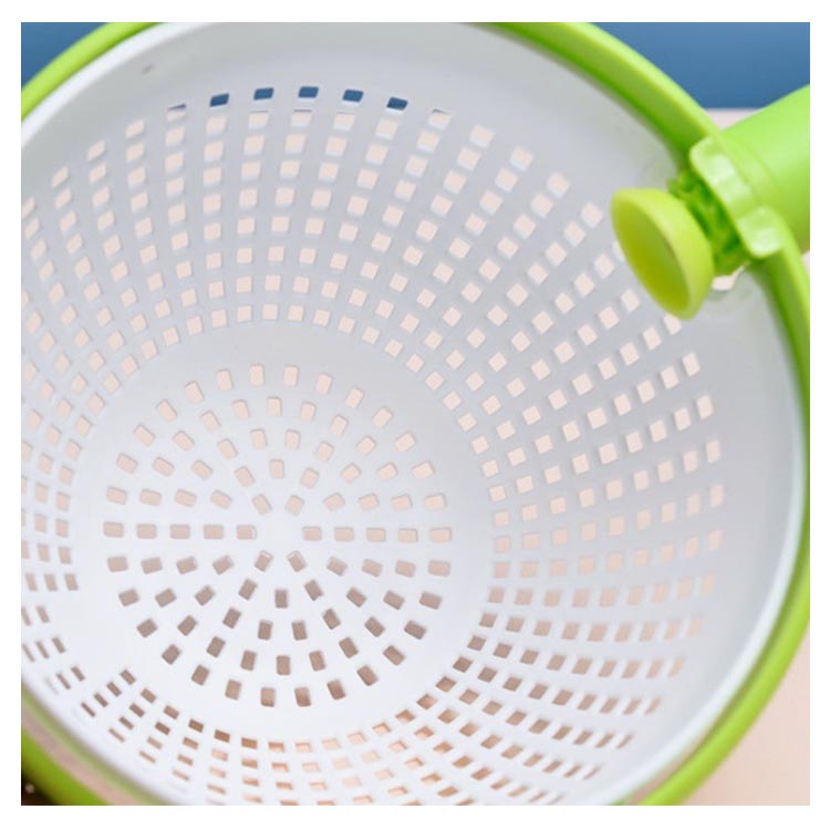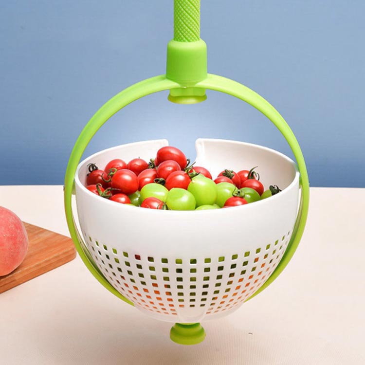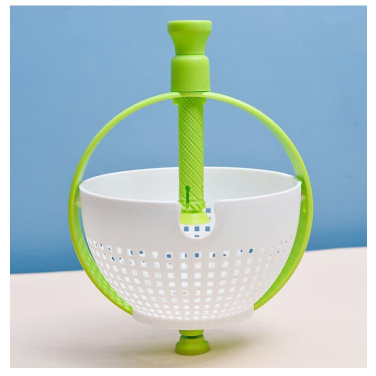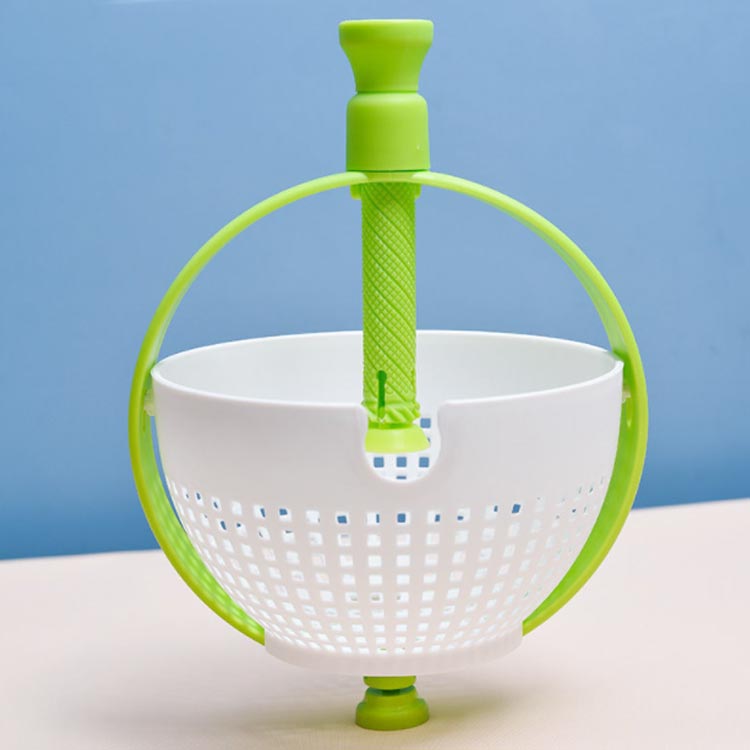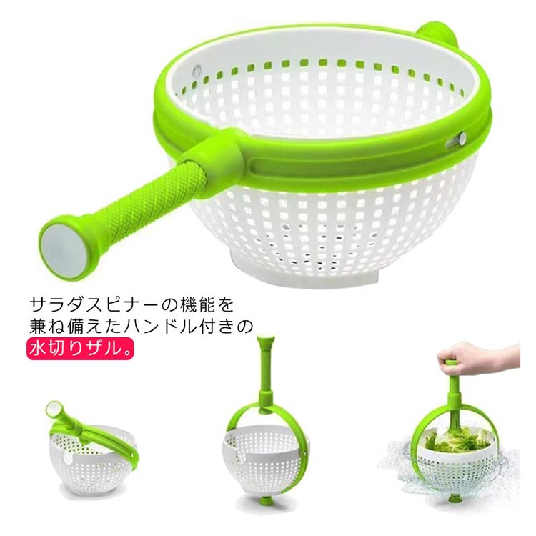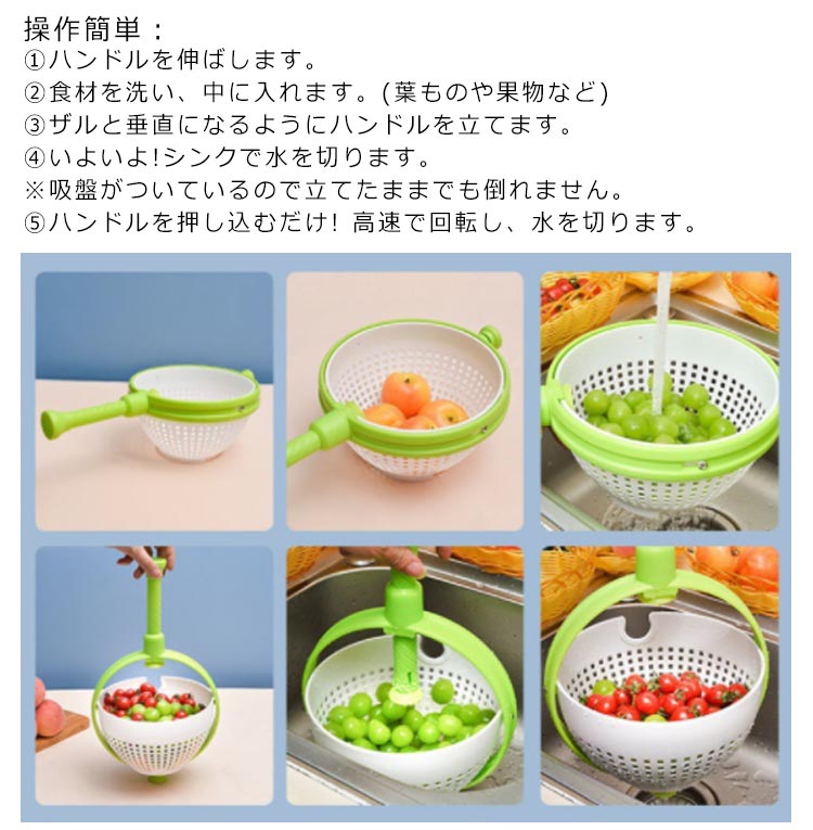 サラダスピナーの機能を兼ね備えたハンドル付きの水切りザル。シンクの中でハンドルを垂直に押し込むと、ザルが回転して遠心力で水を切れます。吸盤がシンクに吸着するので、安定感バツグン!ハンドル付の水切りザルとしても使えます。収納時は、ハンドルを短く押し込み、省スペースで収納できます。操作簡単:1.ハンドルを伸ばします。2.食材を洗い、中に入れます。(葉ものや果物など)3.ザルと垂直になるようにハンドルを立てます。4.いよいよ!シンクで水を切ります。※吸盤がついているので立てたままでも倒れません。5.ハンドルを押し込むだけ! 高速で回転し、水を切ります。