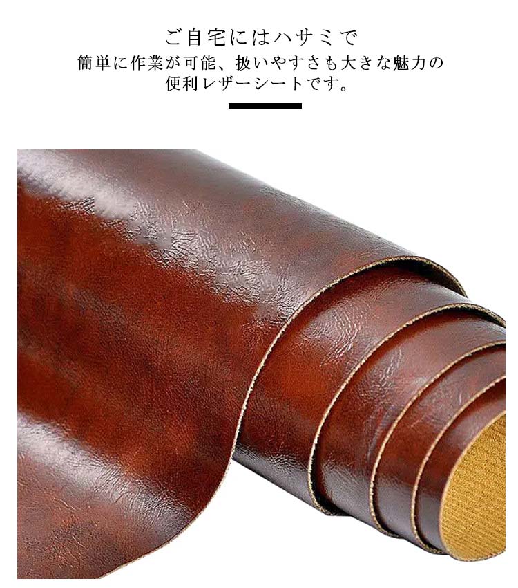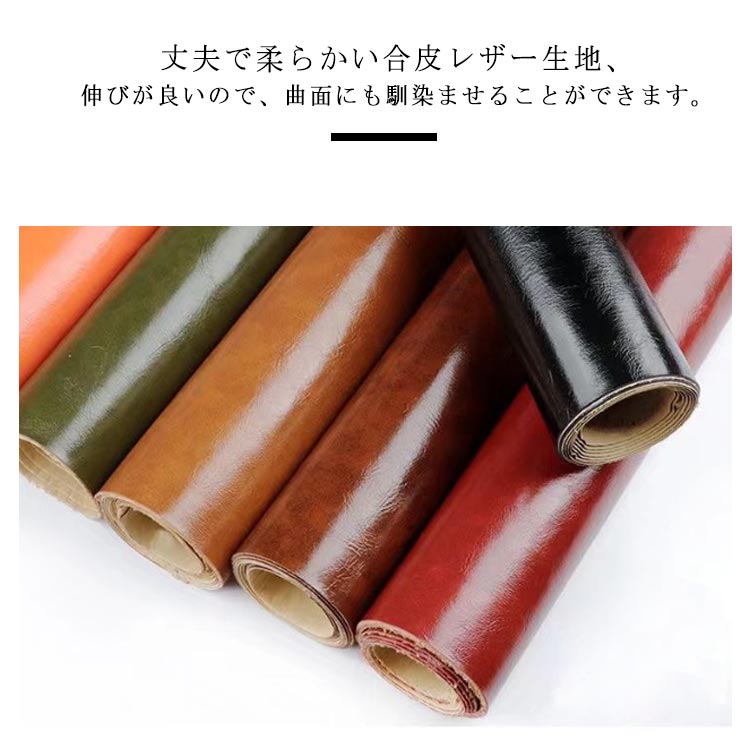 全11色!貼るレザー!防水、柔らかめ、接着性抜群!丈夫で柔らかい合皮レザー生地、伸びが良いので、曲面にも馴染ませることができます。表面は合皮無地、若干光沢があり、高級感があります。本物のような質感で高級感を演出してくれます!合皮レザー生地の裏面が接着シールになっており、様々な物に貼り付けることが出来ます。接着剥の粘着力が優れていて簡単に剥がれません。ご自宅にはハサミで簡単に作業が可能、扱いやすさも大きな魅力の便利レザーシートです。豊富なカラーバエーション気軽に、インテリアのイメージチェンジも楽しめます!自分好みのインテリアが実現!補修シールとして自転車のサドル・車のシート・バイクのシート・ソファーのシートなどの張り替え、修補、破れ隠し、椅子の座面張替。壁紙、インテリア、DIYなどにも使用でき、色々な用途にご利用いただくことができます。化粧箱、ギフトケースなどに貼るにも最適です。