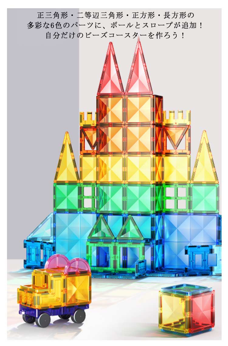 40PCS男の子、女の子、子どもから大人までこの磁気おもちゃを楽しめます。楽しみながら学ぶドリルで3歳、4歳、5歳、小学生と長い期間お役立て頂けますしっかりとした磁力を持ちながら、お子様が指を挟んでも痛くならない安全仕様。万が一、口に入れても安心のABS素材を使用した磁石おもちゃ。プラスティックが透明で内部構造が理解しやすくなっています。正三角形・二等辺三角形・正方形・長方形の多彩な6色のパーツに、ボールとスロープが追加!自分だけのビーズコースターを作ろう!保育園、幼稚園、幼児教室、キッズ スペースへの納入も多数あり、お誕生日、入園祝い、入学祝い、クリスマスなどの プレゼント、ギフト、贈り物に選ばれています!