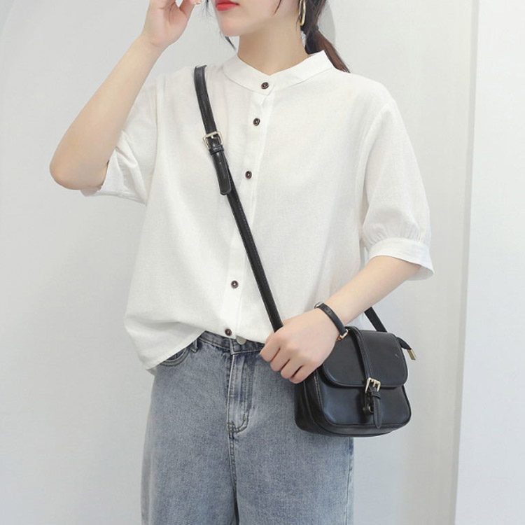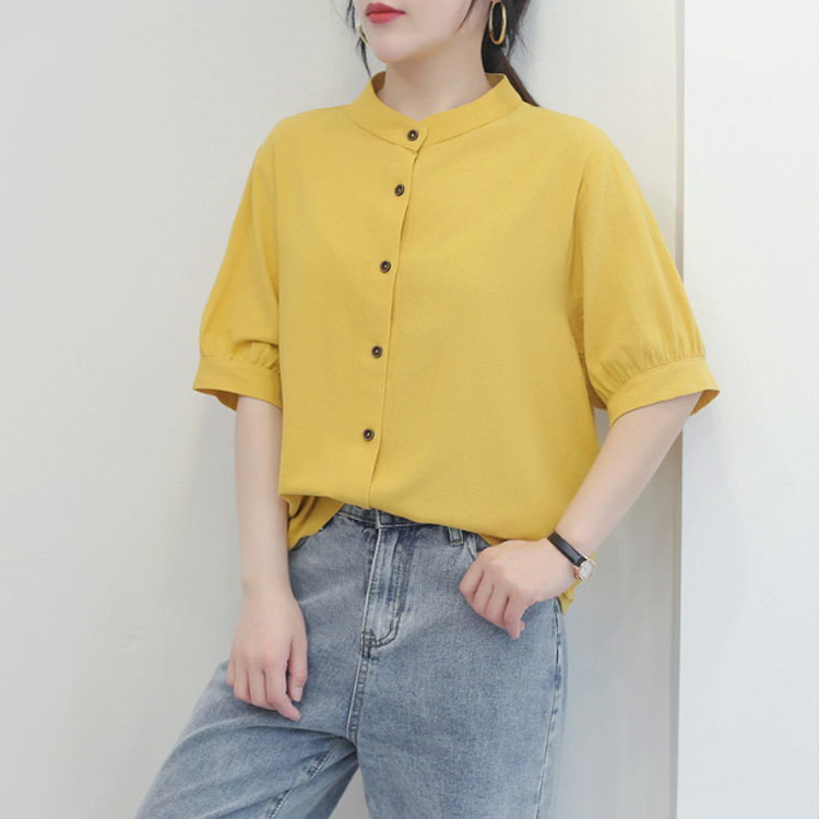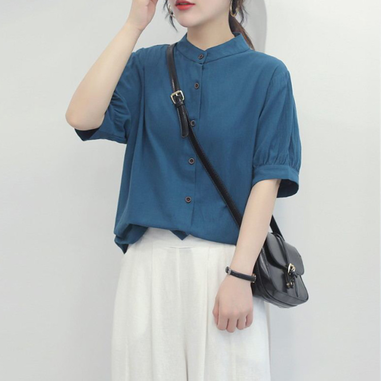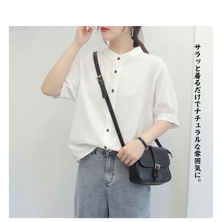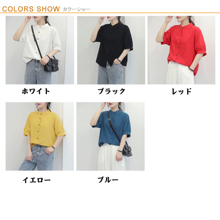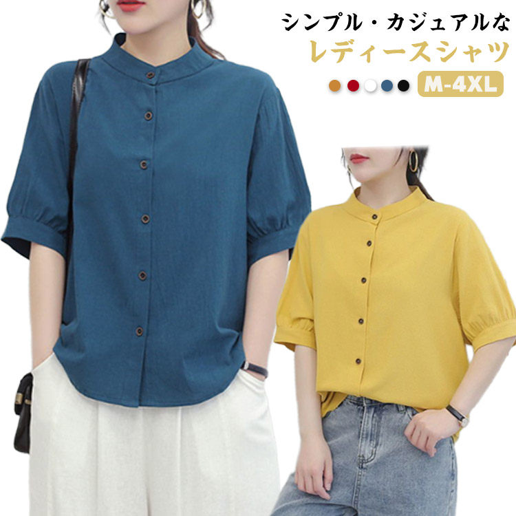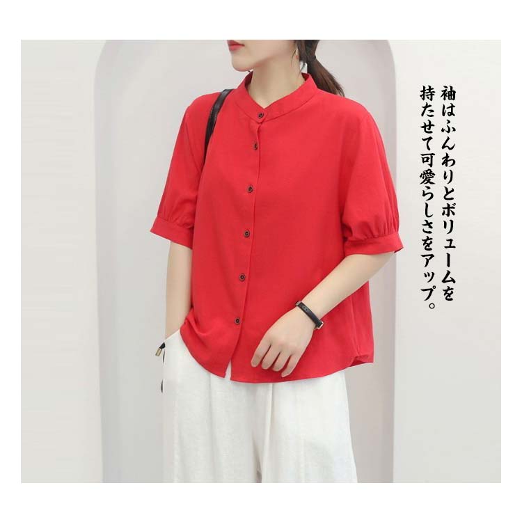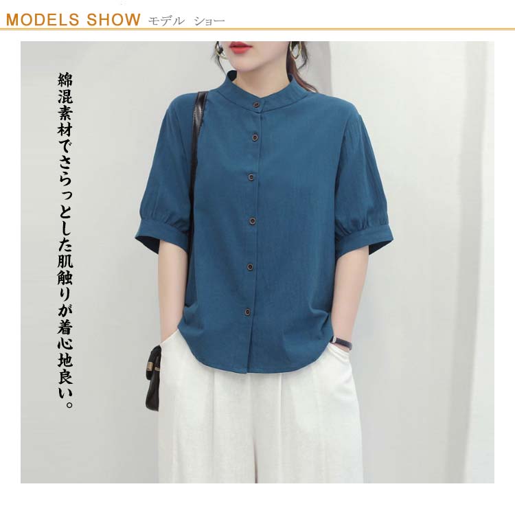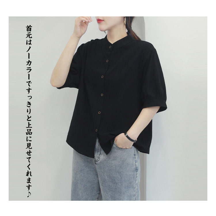 コットンシャツ レディース 半袖 ノーカラー ブラウス トップス 大人可愛い 夏 春秋 無地 シンプル 大きいサイズ ゆったり 柔らか カジュアル おしゃれ 森ガール エスニック オフィス 通勤 通学 ナチュラル 体型カバー 送料無料