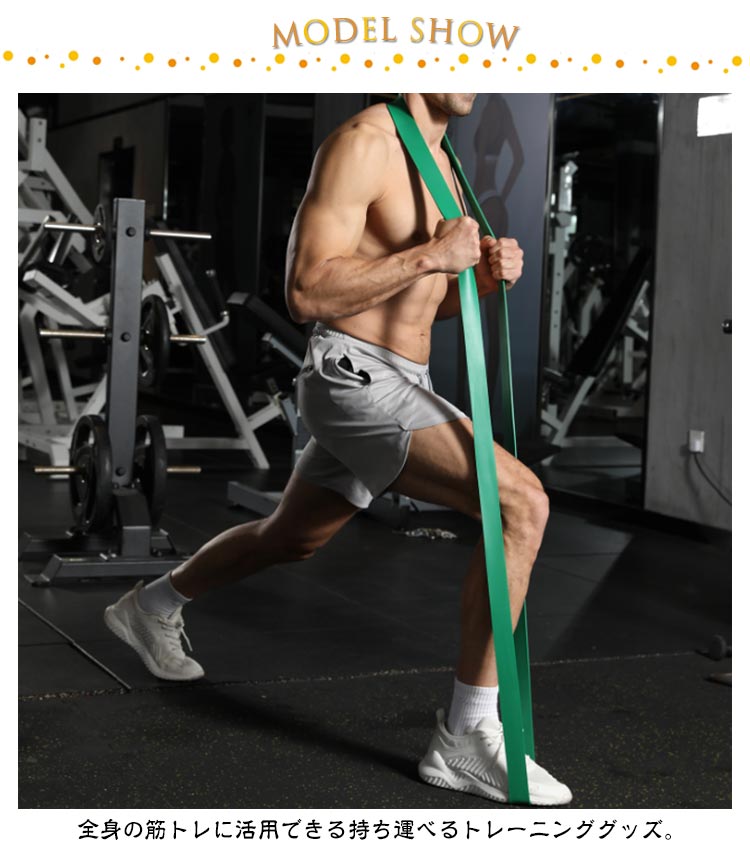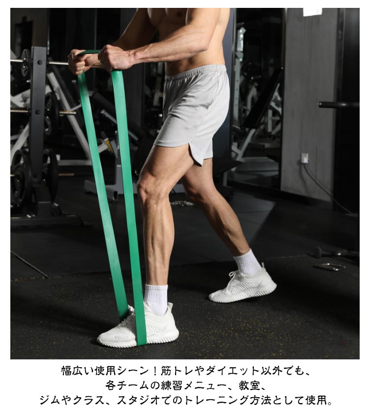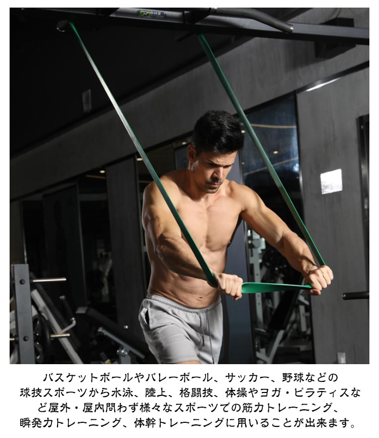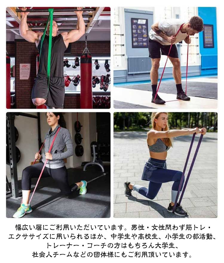 選べる強度、自分に合ったトレーニングで徐々にステップアップできる。全身の筋トレに活用できる持ち運べるトレーニンググッズ。自宅やオフィス、旅行先でもトレーニングができる。ゴムの張力を利用した負荷のかけ方なので、ケガのリスクも減り安心。幅広い使用シーン!筋トレやダイエット以外でも、各チームの練習メニュー、教室、ジムやクラス、スタジオでのトレーニング方法として使用。バスケットボールやバレーボール、サッカー、野球などの球技スポーツから水泳、陸上、格闘技、体操やヨガ・ピラティスなど屋外・屋内問わず様々なスポーツでの筋力トレーニング、瞬発力トレーニング、体幹トレーニングに用いることが出来ます。幅広い層にご利用いただいています。男性・女性問わず筋トレ・エクササイズに用いられるほか、中学生や高校生、小学生の部活動、トレーナー・コーチの方はもちろん大学生、社会人チームなどの団体様にもご利用頂いています。