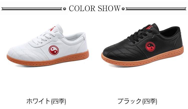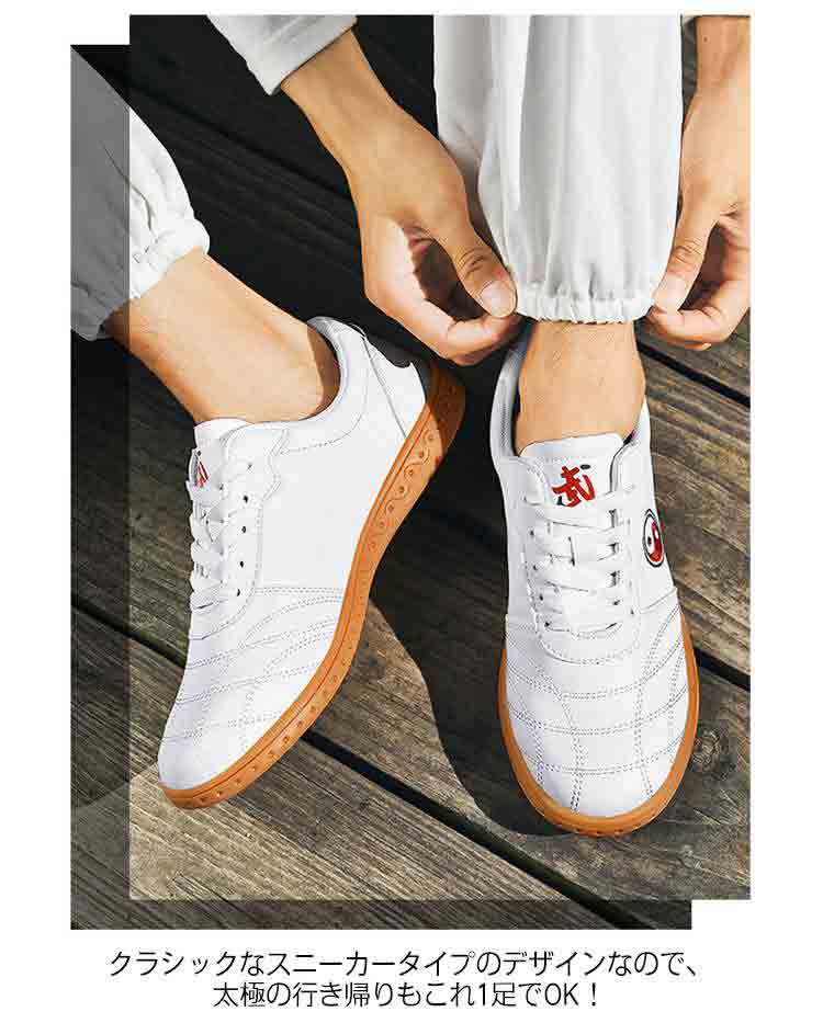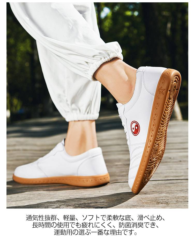 クッション性と耐久性を両立したラバーソールを採用された!長時間歩いていても疲れにくいデザインとなってます!!通気性抜群、軽量、ソフトで柔軟な底、滑べ止め、長時間の使用でも疲れにくく、防菌消臭でき、運動用の選ぶ一番な理由です。クラシックなスニーカータイプのデザインなので、太極の行き帰りもこれ1足でOK!