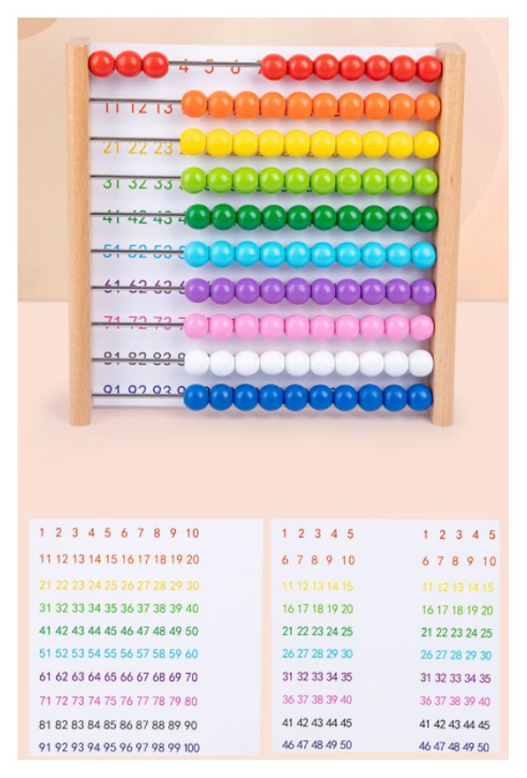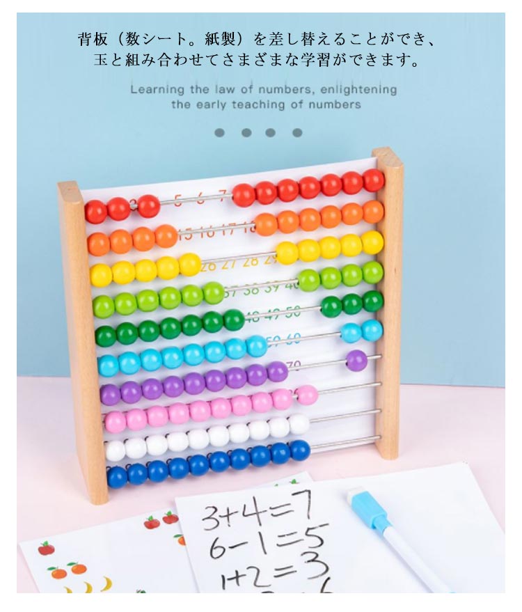 | 数の数え方や簡単な計算を視覚的に分かりやすく、遊びながら学べる100玉そろばん。 いろいろな数と果物の勉強ができるシートが付いています。 背板(数シート。紙製)を差し替えることができ、玉と組み合わせてさまざまな学習ができます。 玉をスライドさせることで、指先の器用さや数の理解を深めることができます。 | |