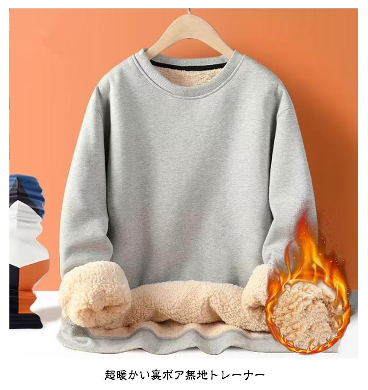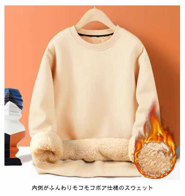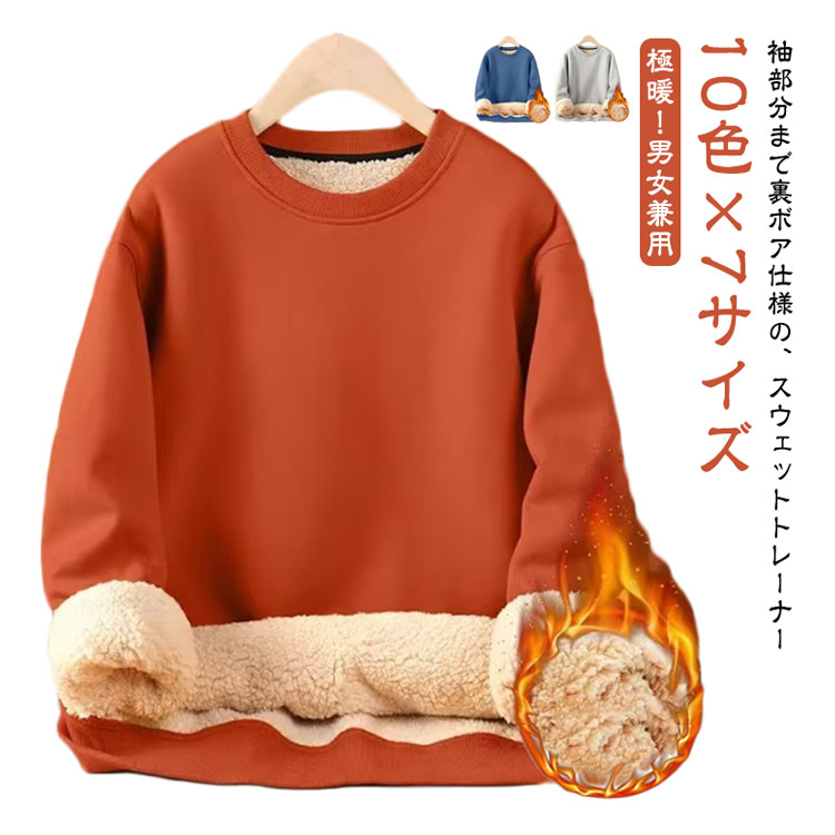 | 10色×7サイズ 男女兼用 極暖!袖部分まで裏ボア仕様の、スウェットトレーナー 超暖かい裏ボア無地トレーナー 内側がふんわりモコモコボア仕様のスウェット 毛布に包まれたような暖かさで、寒い季節の部屋着やパジャマにおすすめ | |