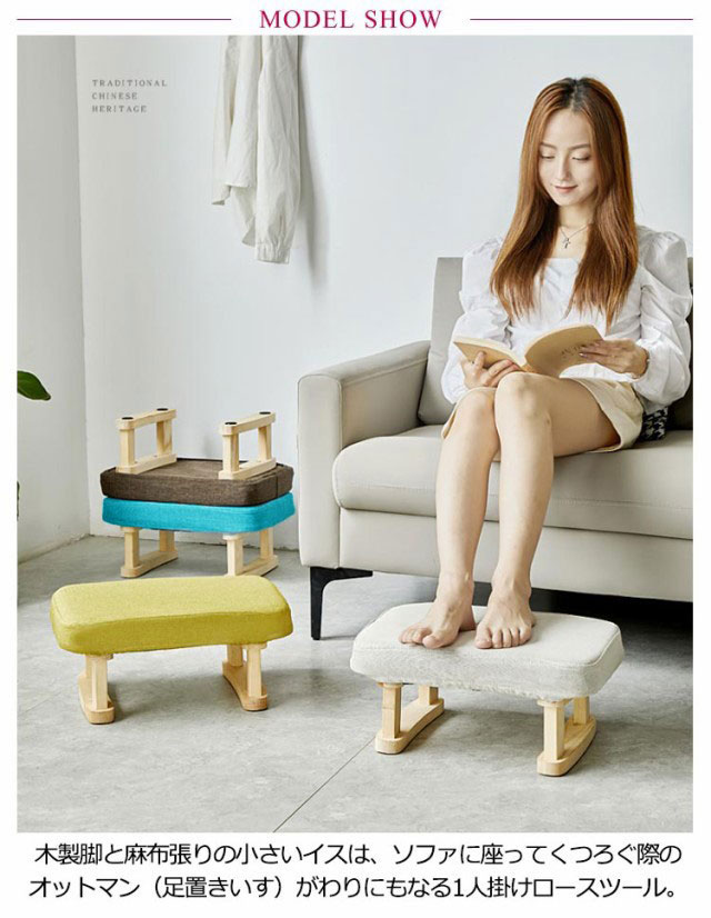 | 【カバー付き 洗える】 木製脚と麻布張りの小さいイスは、ソファに座ってくつろぐ際のオットマン(足置きいす)がわりにもなる1人掛けロースツール 子供のお食事、お絵描き用、玄関で靴の脱ぎ履きに、リビングでオットマンにもピッタリ? スクエアの小型椅子は足付きで安定感があります。 木製の脚の底には傷防止と滑り止めが付いています。 カバーは取外しでき、洗濯機で洗えます。いつでも清潔に使えて安心? | |
