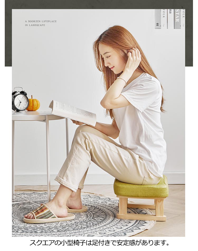 【カバー付き 洗える】木製脚と麻布張りの小さいイスは、ソファに座ってくつろぐ際のオットマン(足置きいす)がわりにもなる1人掛けロースツール子供のお食事、お絵描き用、玄関で靴の脱ぎ履きに、リビングでオットマンにもピッタリ♪スクエアの小型椅子は足付きで安定感があります。木製の脚の底には傷防止と滑り止めが付いています。カバーは取外しでき、洗濯機で洗えます。いつでも清潔に使えて安心♪