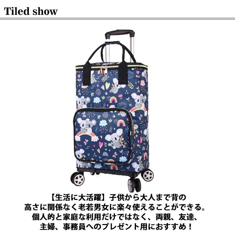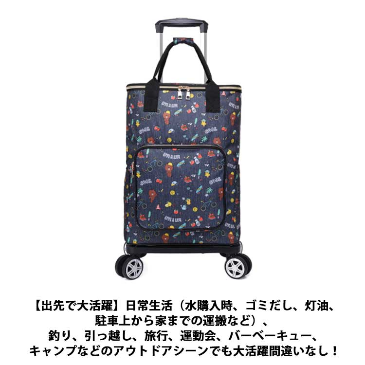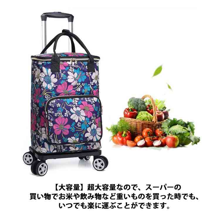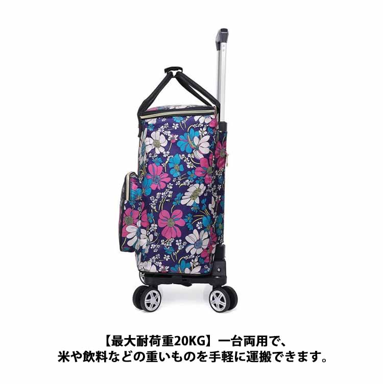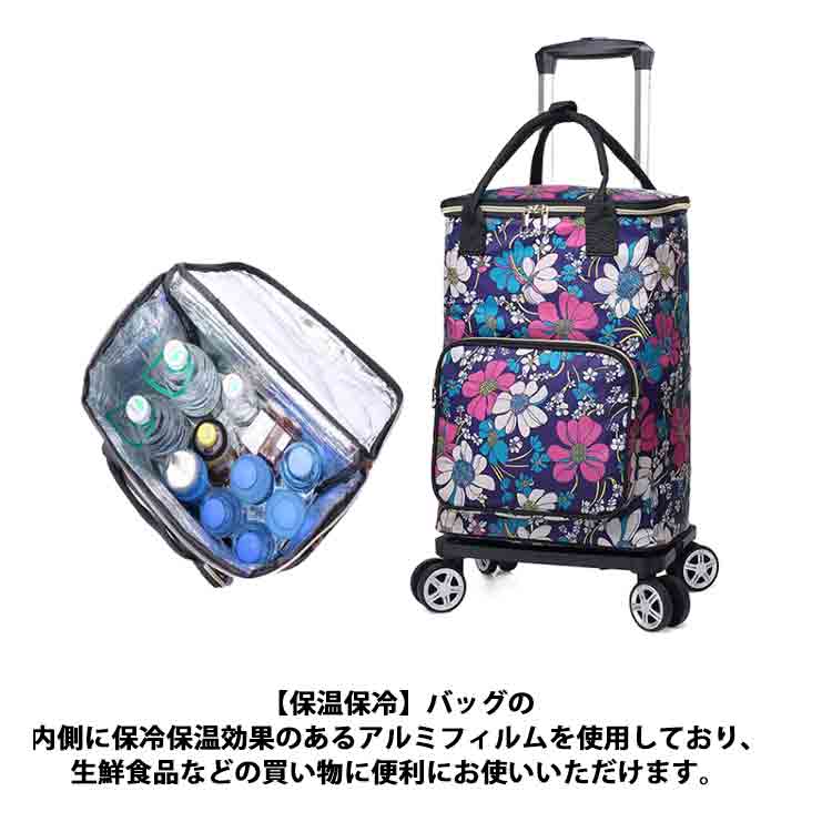 【ショッピングカート】【4輪大容量】【保温・保冷】【12color】【保温保冷】バッグの内側に保冷保温効果のあるアルミフィルムを使用しており、生鮮食品などの買い物に便利にお使いいただけます。【折り畳み収納便利】バッグを取り外して、キャリーを簡単に折り畳んでバッグを入ることができます。使用していない時はコンパクトに折り畳めるので、リビングに置いても場所を取りません。【大容量】超大容量なので、スーパーの買い物でお米や飲み物など重いものを買った時でも、いつでも楽に運ぶことができます。【最大耐荷重20KG】一台両用で、米や飲料などの重いものを手軽に運搬できます。【安定感抜群の4輪】耐久性・安定性に優れたタイヤを採用します。360度回転するので、スムーズに方向を変えやすいです。静音設計により、走行時の音が気になりにくいのはメリットです。【ハンドルは3段階伸縮可能】乗せる荷物の大きさや使う人の身長に応じて、ハンドルのボタンを押すことで高さが3段階調整できます。【生活に大活躍】子供から大人まで背の高さに関係なく老若男女に楽々使えることができる。個人的と家庭な利用だけではなく、両親、友達、主婦、事務員へのプレゼント用におすすめ!【出先で大活躍】日常生活(水購入時、ゴミだし、灯油、駐車上から家までの運搬など)、 釣り、引っ越し、旅行、運動会、バーべーキュー、キャンプなどのアウトドアシーンでも大活躍間違いなし!