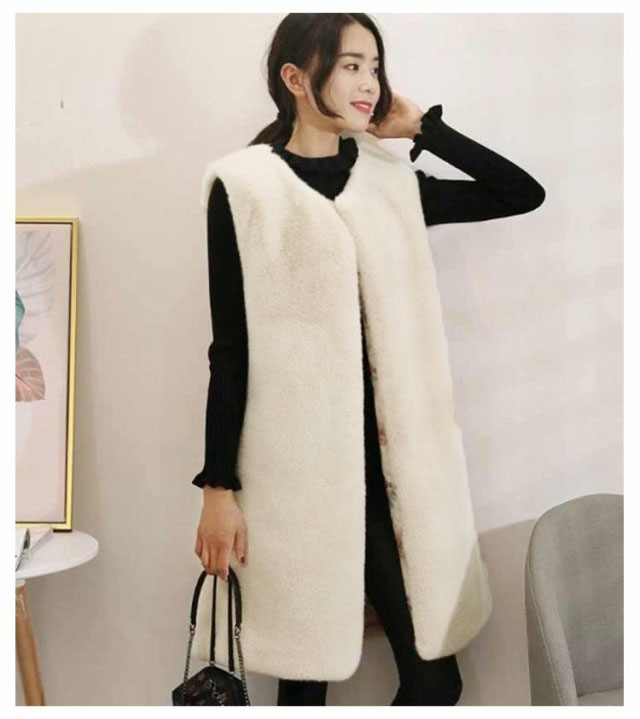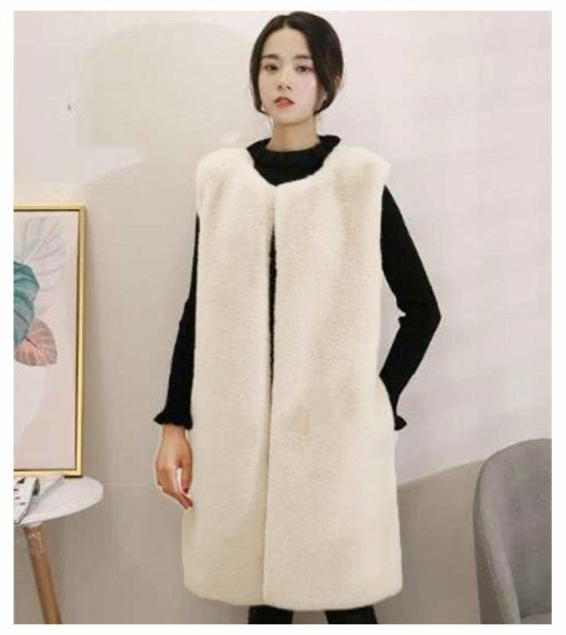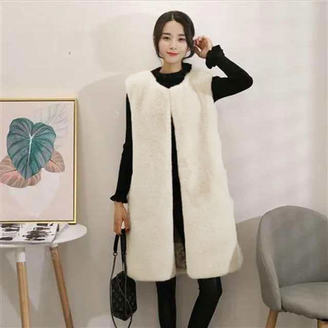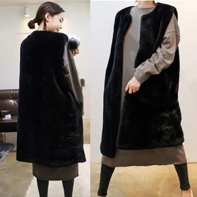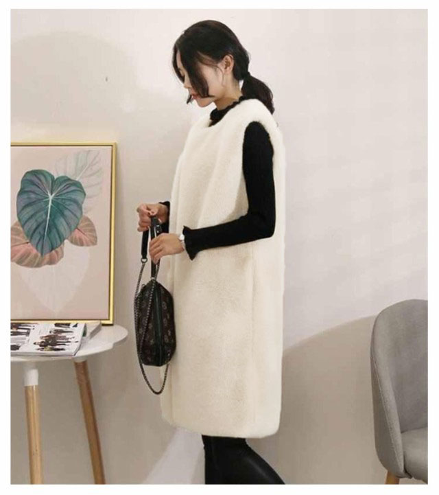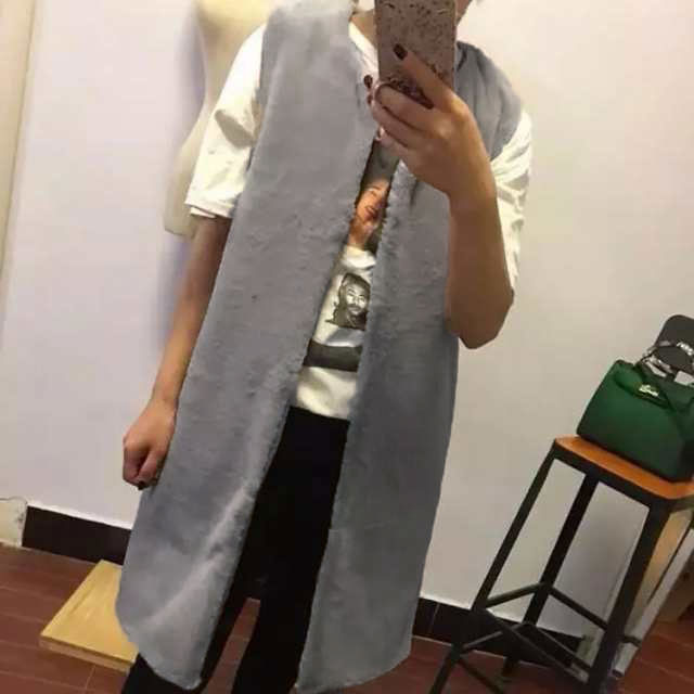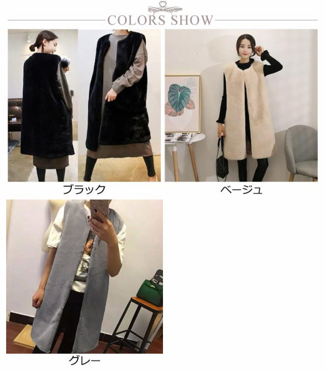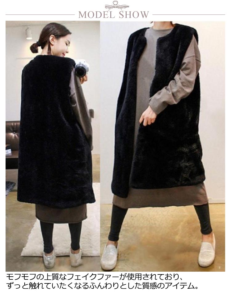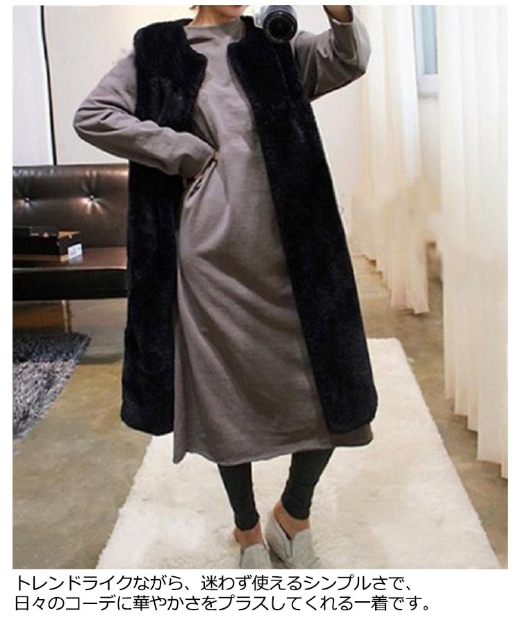 エコ ファー ベスト レディース 春 秋冬 コーデ 前開き ロング丈 ひざ下 モフモフ もこもこ ふわふわ ボリューム ファー ジレ フェイクファー エコファー コード ノースリーブ 袖なし シンプル 大人 カジュアル レイヤード 黒 ブラック グレー ベージュ 送料無料