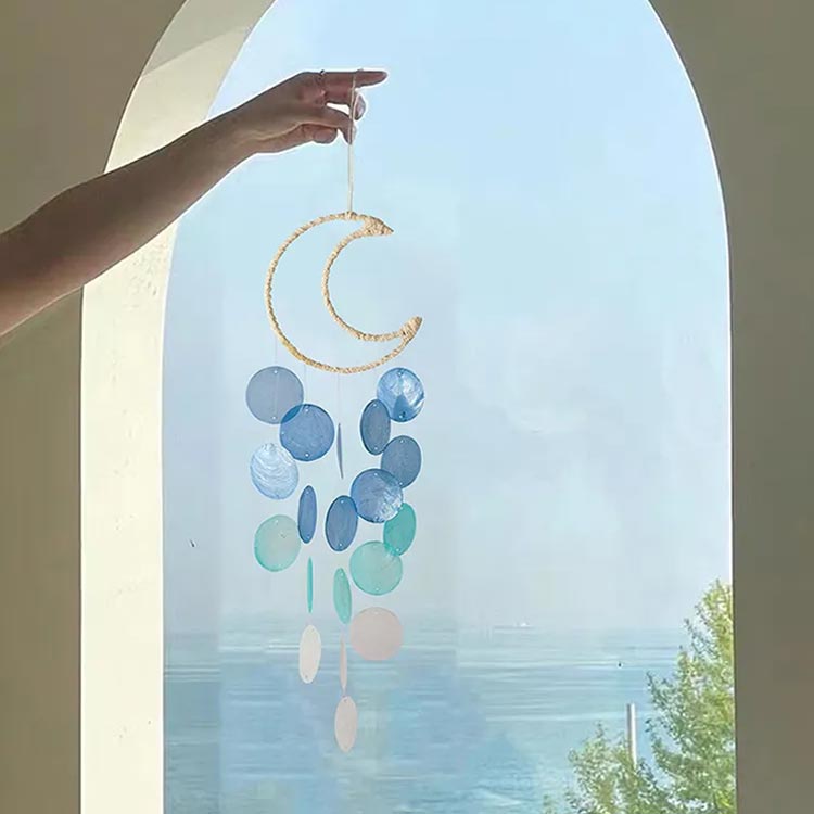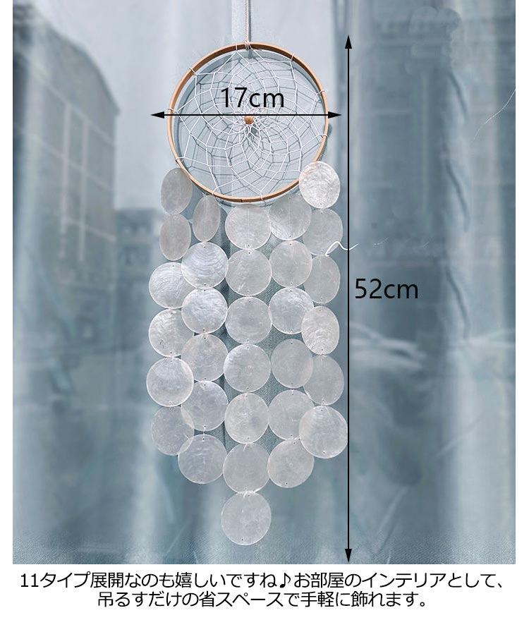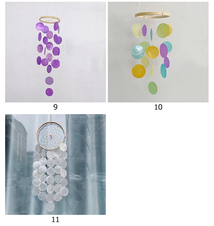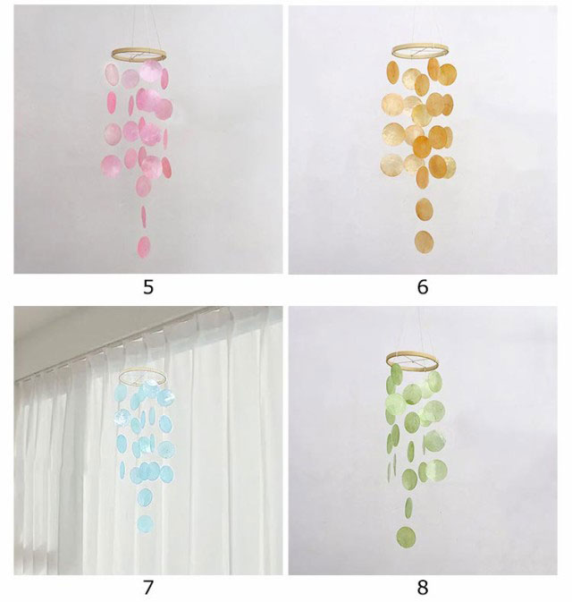 | 透き通るような美しい音色のウインドチャーム。 音色だけでなくデザイン性にもこだわった、風鈴といえども季節問わず飾れるアイテム。 貝殻のパーツは1枚ずつ丁寧にくり抜き、すりガラス風に仕上げたものに色付けし、しっかりと吊下げたもの。 貝殻の少しずつ重なり合って出来た程よい透け感の美しさに見惚れてしまいそう。 11タイプ展開なのも嬉しいですね?お部屋のインテリアとして、吊るすだけの省スペースで手軽に飾れます。 | |