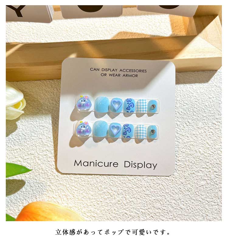 | 選べる9タイプ!つけて貼るだけ!子供向けの立体感のある3Dネイルチップ12枚セットです。 貼るだけなので、爪への負担は少なく、オフも簡単です。 立体感があってポップで可愛いです。 普段使いやおでかけにもぴったりです。 | |